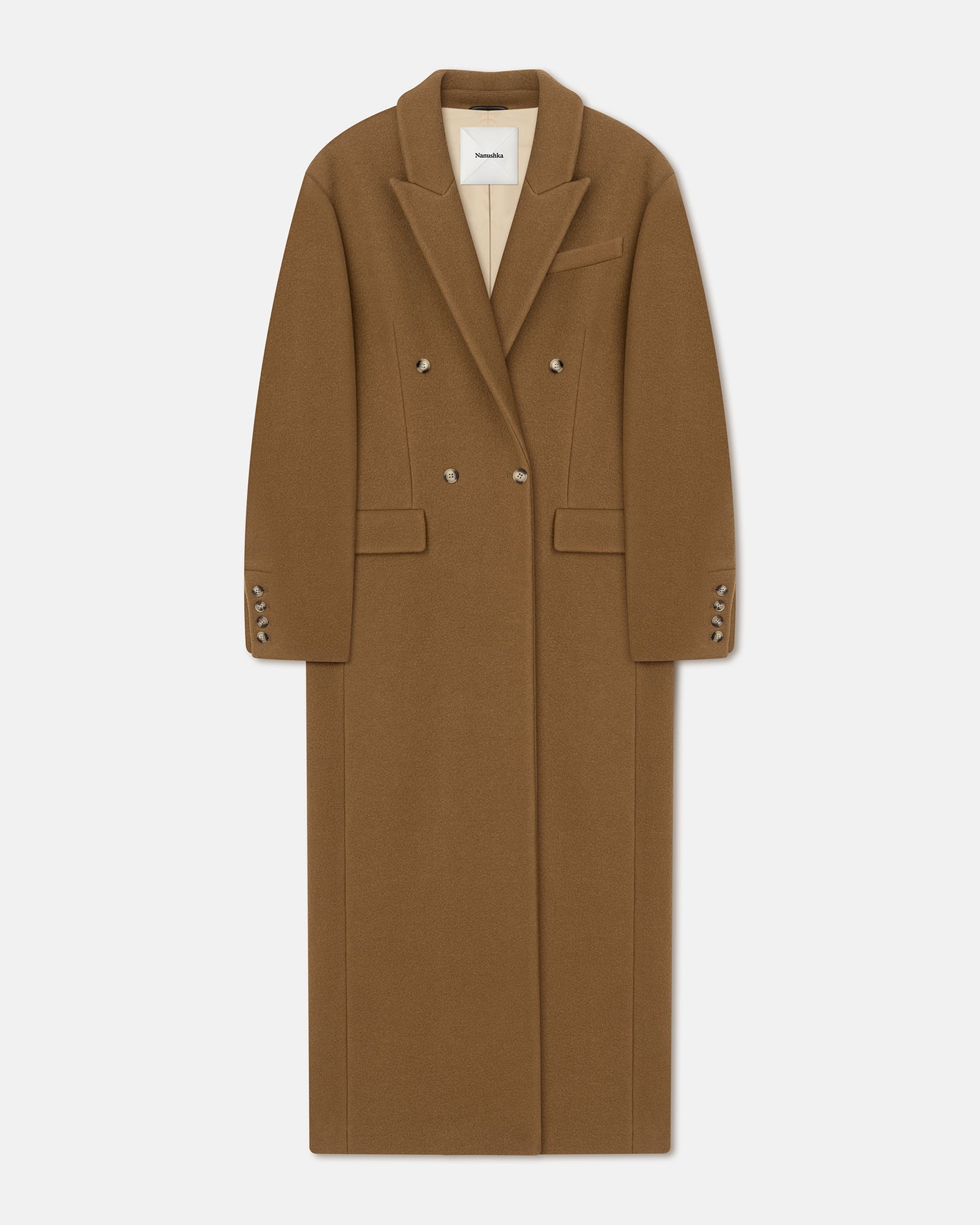 The Ferris coat is made from soft and substantial felted wool, and cut to an oversized double-breasted silhouette that falls right to the floor. With notched lapels, discreet pockets and rich walnut tone, it’s a contemporary piece to treasure forever. Fit Standard fit, matches usual sizing. Materials and Care Shell: 75% Wool 25% Polyamide Do not wash, do not bleach, do not tumble dry, iron low heat (110°), dry clean any solvent except trichloroethylene handle with care to ensure garment lifespan. repair or resell to support circular fashion.