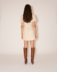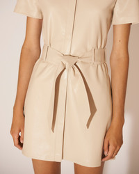 The Halli dress is made from OKOBOR™ in a pristine creme tone. Part of our Core collection, it has a classic point collar and waist-cinching belt. OKOBOR™ is exclusive to Nanushka. Our new alternative to leather, with 100% recycled backing and a more responsible composition. Previously referred to as vegan leather, alt-leather is free from the use of animal skin or derivatives. Body 56% RECYCLED POLYESTER Body 44% POLYURETHANE Lining 100% POLYESTER