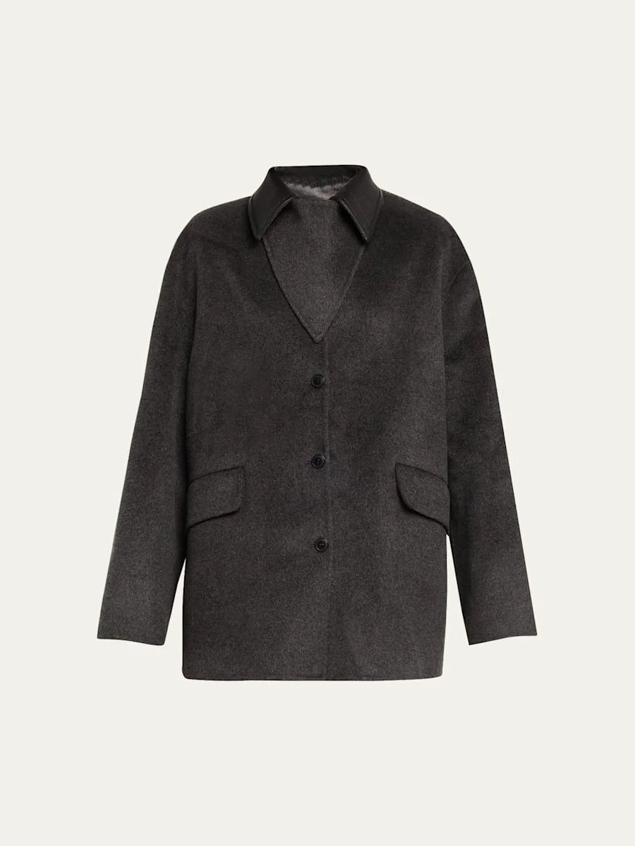 Crafted from double wool, the "Jada" jacket by Nanushka boasts a regenerated leather collar and an oversized silhouette with tailored detailing. Spread collar Singlebreasted front Dropped shoulders Long sleeves Hip flap pockets Relaxed fit Buttonfront Wool/silk/polyester Dry clean Imported