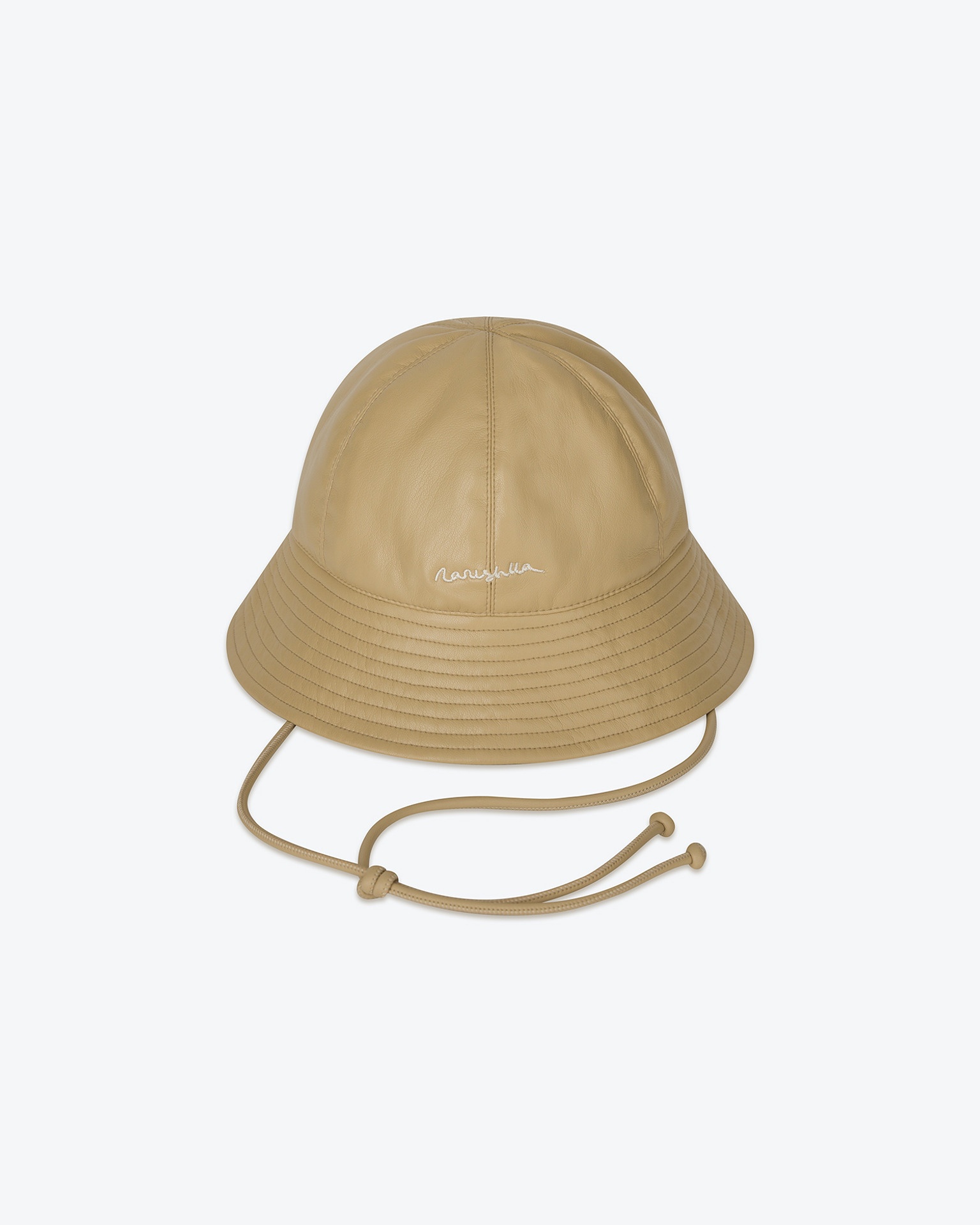 The Laurie hat is made from signature OKOBOR™ alt leather in a light wax toneIt is finished with logo lettering at the front and drawstring ties for a secure fit. OKOBOR™ is exclusive to Nanushka. Our new alternative to leather, with 100% recycled backing and a more responsible composition. Previously referred to as vegan leather, alt-leather is free from the use of animal skin or derivatives. Shell 100% COATING POLYURETHANE;BASE 100% POLYESTER RECYCLED