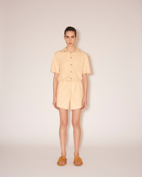 Our glossy vegan leather subverts the laid-back feel of the playsuit silhouette. The Leni is cut with a sharp point collar and short sleeves, and leads into shorts with sporty curved hems. Define the silhouette via the drawstring waist. Model is 176 cm (5’9’’) tall and wears a size S. Body: 65% Polyester 35% Polyurethane Lining: 56% Acetate 44% Viscos