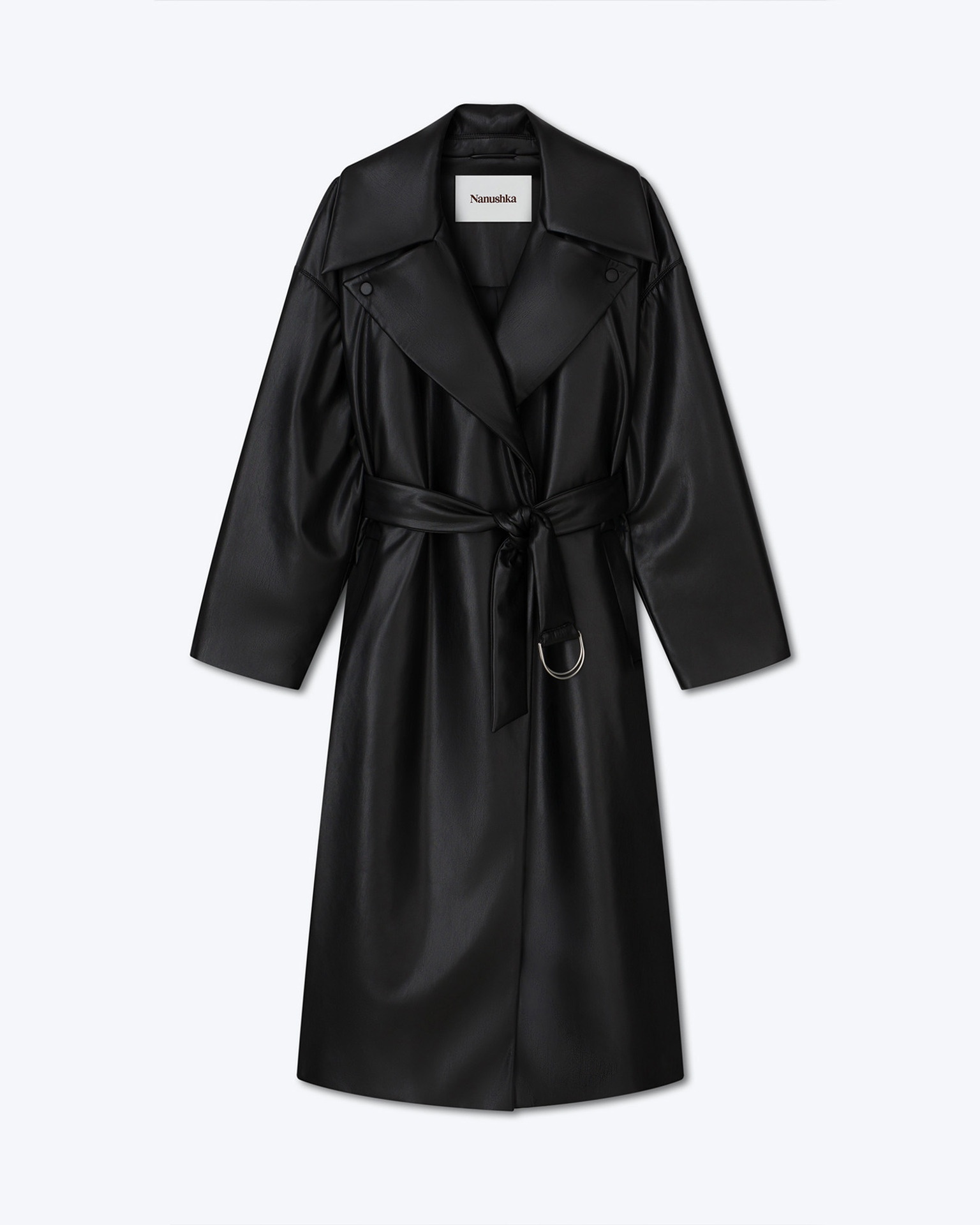 Our trademark OKOBOR™ alt-leather is the hero of Liano's story. Seen here in black, the oversized fit, extra-wide collar and tie belt are all designed to swaddle its wearer in luxury. OKOBOR™ is exclusive to Nanushka. Our new alternative to leather, with 100% recycled backing and a more responsible composition. Previously referred to as vegan leather, alt-leather is free from the use of animal skin or derivatives. Body: Coating: Polyurethane Backing: 100% Polyester (Recycled) Lining: 100% Viscose Padding: 100% Polyester