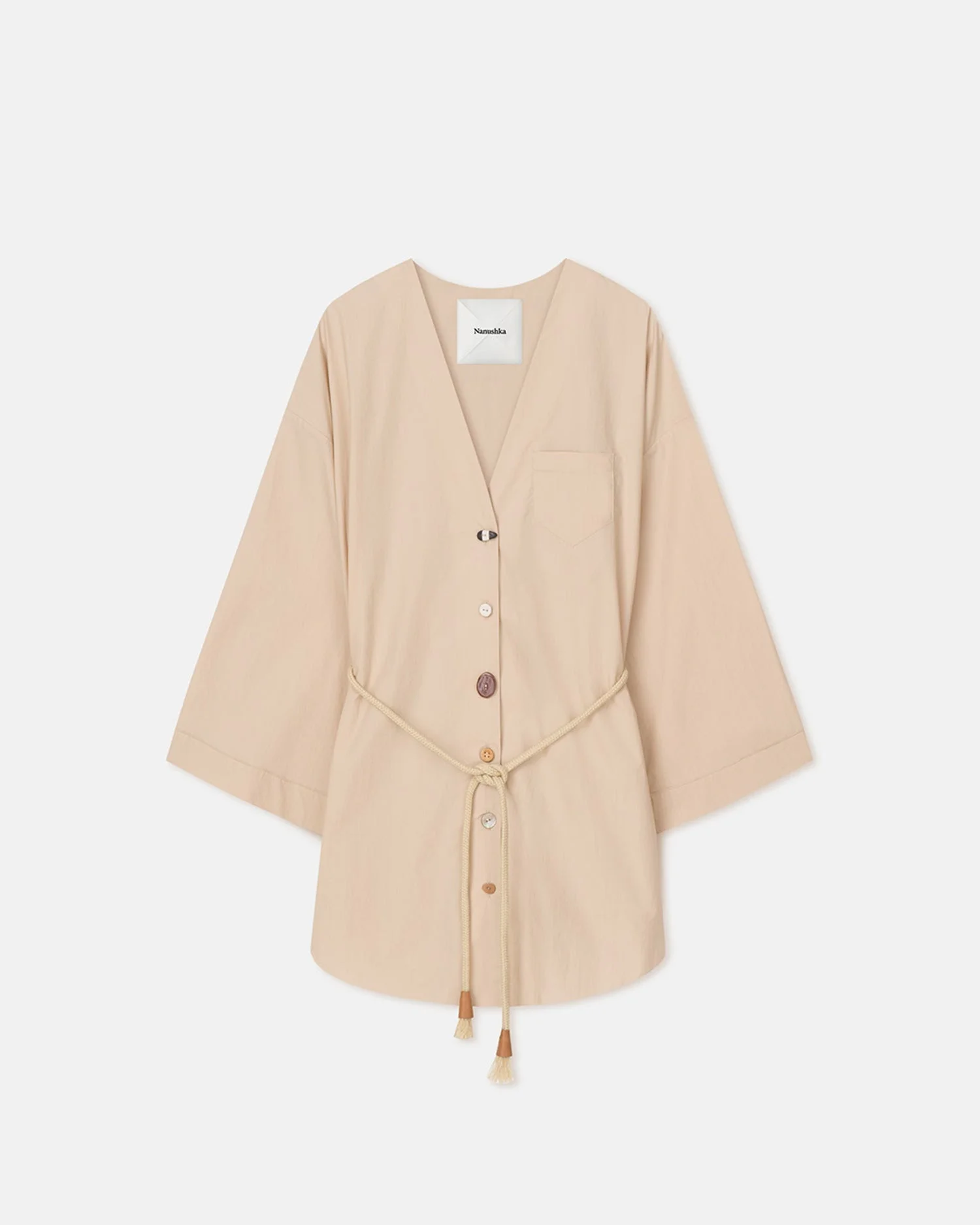 The Nani shirt is an effortless summer style crafted with responsibility in mind. It has an easy-going oversized silhouette made from light poplin and standout buttons that have been upcycled from previous collections – we never let materials go to waste. Cinch the waist with the accompanying tubular belt. Nanushka introduces RECRAFTED - a capsule reimagining the lifecycle of the Nanushka garment. With a commitment to responsible consumption, the capsule transforms surplus materials into new, elevated pieces, breathing fresh life into archive designs. Fit Intentionally designed for an oversized look. Materials and Care Shell: 100% Cotton Machine wash warm (30°) permanent press, do not bleach, tumble dry low heat, iron medium heat (150°), dry clean any solvent except trichloroethylene Handle with care and wash less to ensure garment lifespan. Repair or resell to support circular fashion.