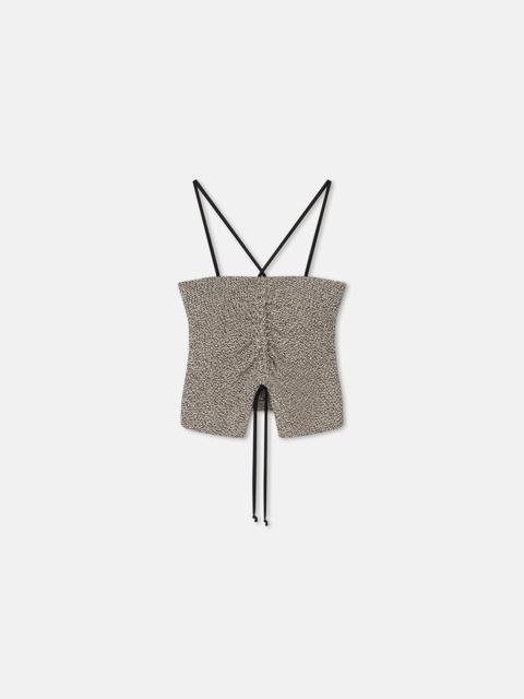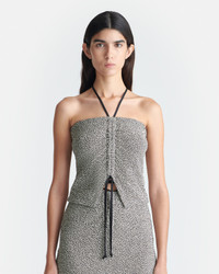 The Soraia top is made from cotton consisting of looped black and creme threads – a new fabric technique to celebrate our 20th anniversary as a brand. It has a flattering ruched front that you can exaggerate with the strings. Fit Tailored to be fitting against the body. Materials and Care Shell: 100% Cotton Do not wash, do not bleach, do not tumble dry, iron low heat (110°), dry clean any solvent except trichloroethylene, do not wring. Handle with care to ensure garment lifespan. Repair or resell to support circular fashion.