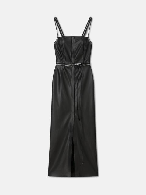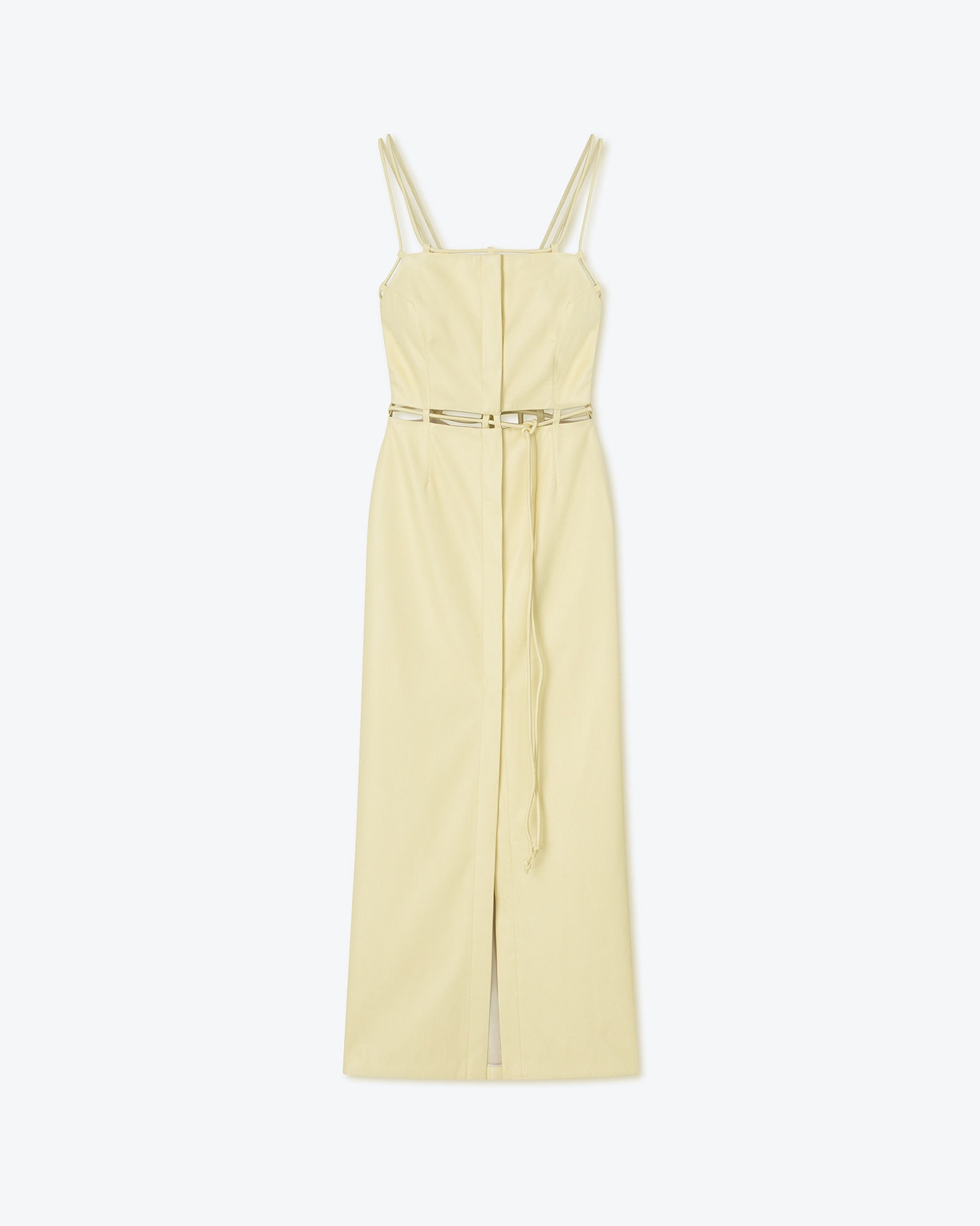 The Loula dress is detailed with knotted ties that create a cutout at the slimmest part of the frame. Cut to graze the ankle, it’s crafted from our innovative OKOBOR™ alt-leather fabrication for supple structure. Coating 100% POLYURETHANE; Backing 100% RECYCLED POLYESTER