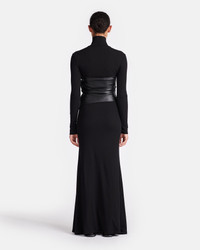 The Amabel dress showcases our modern take on understated silhouettes. It’s made from black mesh jersey for a body-hugging fit and finished with a draped Okobor™ alt-leather bustier panel to further accentuate the frame. Fit Tailored to be fitting against the body. Model is 175 cm (5'9'') and wears a size S Materials and Care Shell: Shell 1: 100% Polyester Shell 2: Polyurethane Base: 100% Polyester Do not wash, do not bleach, do not tumble dry, do not iron, gentle dry clean any solvent except trichloroethylene this product is made from a delicate fabric and has a special finish, the dark colour of this product may transfer onto light surfaces and cause damage, please store separately and handle with care. handle with care to ensure garment lifespan. repair or resell to support circular fashion.