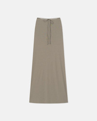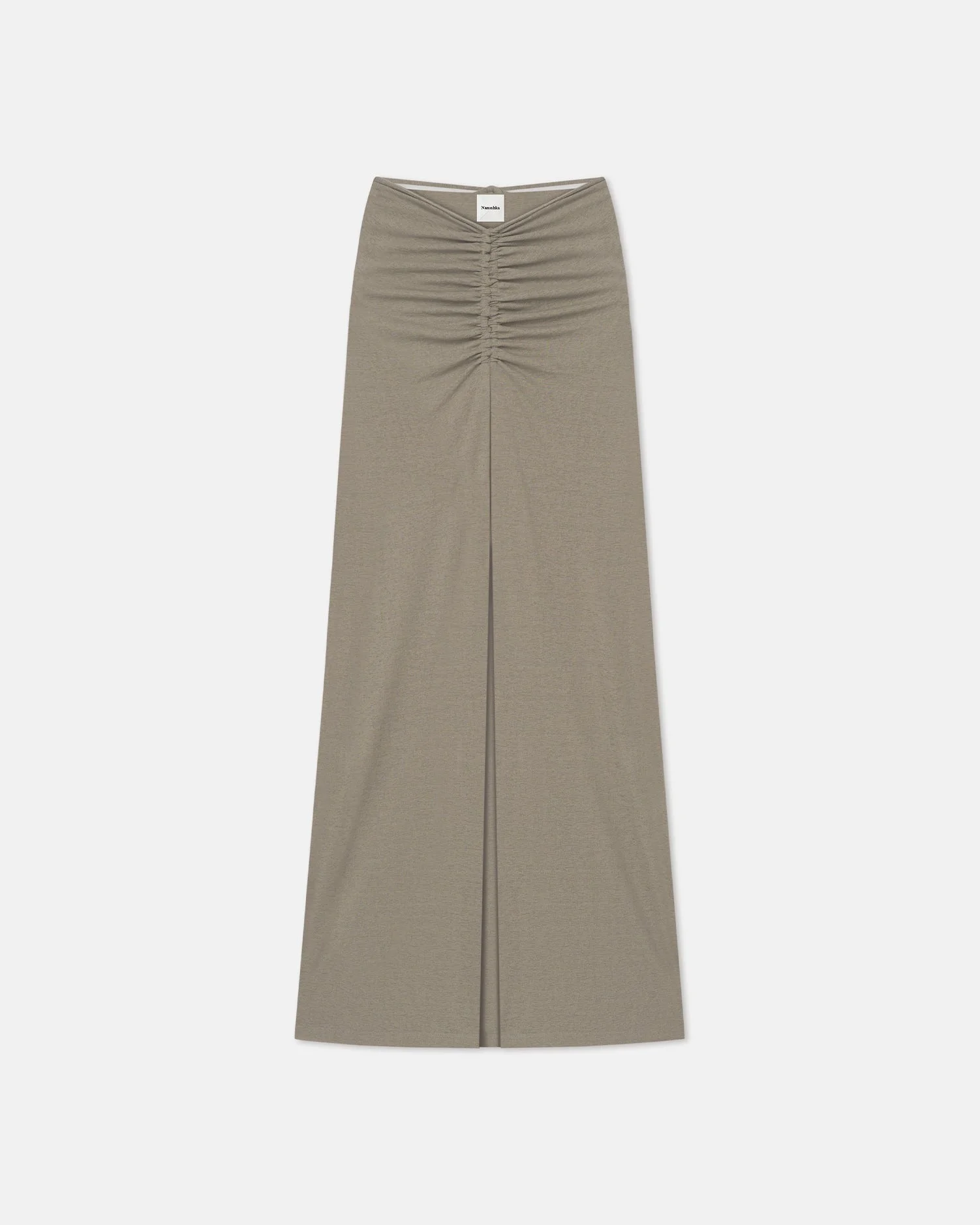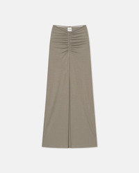 Nanushka’s Cheyen Skirt merges ease with structure. Crafted from mesh jersey, this ruched maxi design features a front slit that enhances movement. In a serene fog hue offering versatile sophistication and everyday wearability with a luxurious edge Fit Standard fit, matches usual sizing Model is 175 cm (5'9") and wears a size S. Materials and Care Shell: 100% POLYESTER Machine wash warm (30°), Do not bleach, Do not tumble dry, Iron low heat (110°), Gentle Dry clean any solvent except Trichloroethylene