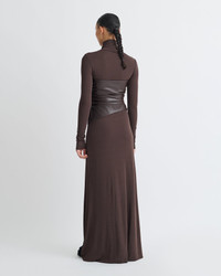The Amabel Dress redefines fluid elegance. Crafted from mesh jersey and dark oak Okobor™ alt leather, this fabric-blocked turtleneck maxi dress retains a feminine feel. Fit Tailored to be fitting against the body. Model is 175 cm (5'9'') and wears a size S. Materials and Care Shell 1: 100% POLYESTER Shell 2: COATING: POLYURETHANE BASE: 100% POLYESTER Do not wash, Do not bleach, Do not tumble dry, Do not iron, Gentle Dry clean any solvent except Trichloroethylene