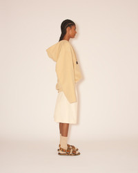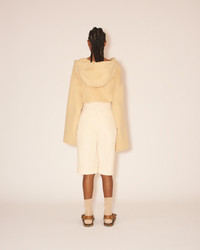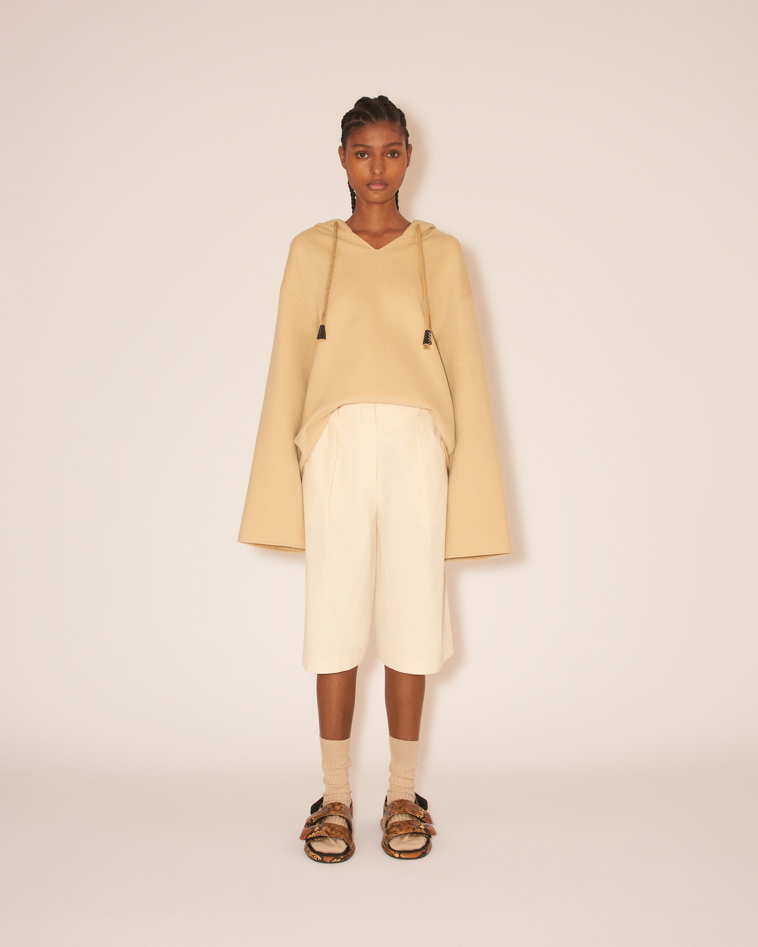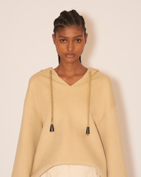 An easy casual cut meets functional refinement. Super soft to the touch - courtesy of our creme light double wool - the Moshe smock top features a relaxed, wide sleeve silhouette and hooded open collar defined by a tonal rope drawstring. Body: 85% WOOL 15% SILK