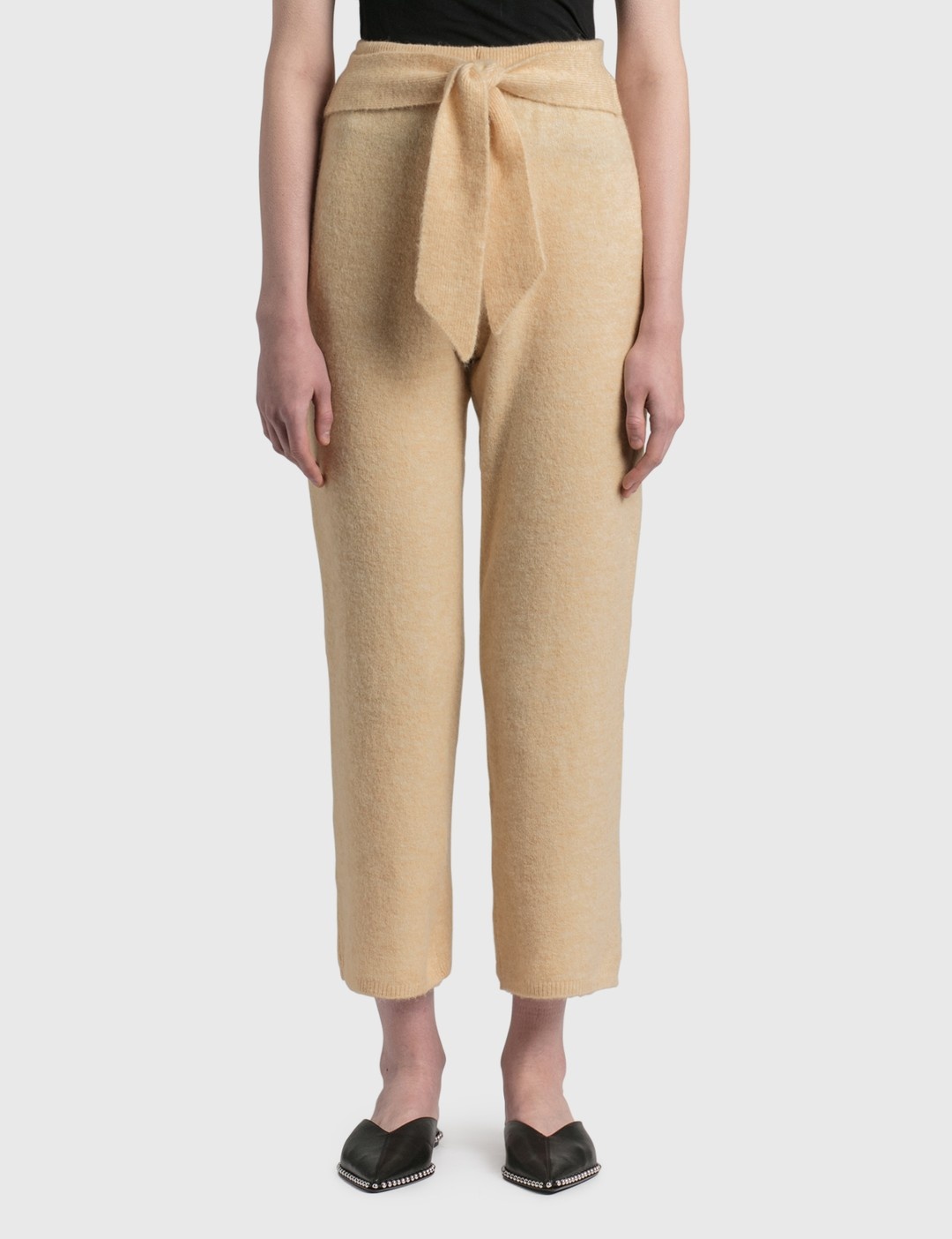 - Nanushka - Nea Fluffy Knit Pants - Relaxed silhouette - Elastic waistband - Tie-fastening belt - Color: Cream - Material: 25% Wool, 15% Baby Alpaca, 26% Polyamide, 32% Acrylic, 2% Elastane - See more Pants and Clothing SIZING - Model wears size S - Model measures: Height 177cm, Chest 32”/81cm, Waist 24”/61cm, Hip 35.5”/90cm