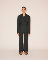 Our wool blend suiting fabric in pine green brings an unexpected formality to the Nicia trousers. Cut to a classic jogger shape, the elasticated waistband is mirrored at the cuffs for a relaxed take on tailoring. LENZING™ ECOVERO™ Viscose is a wood-based and biodegradable fiber made with an eco-responsible production process, certified with the internationally recognized EU Ecolabel. LENZING™ ECOVERO™ Viscose is produced with up to 50 percent less emissions & 50 percent lower water impact than generic viscose. LENZING™ and ECOVERO™ are trademarks of Lenzing AG.” Body: 68% Recycled Polyester 29% ECOVERO™ Viscose 3% Elastane Lining: 56% Acetate 44% Viscose