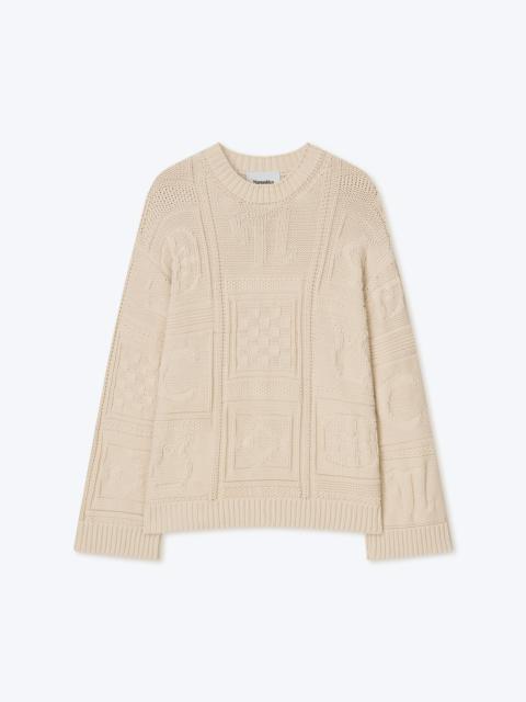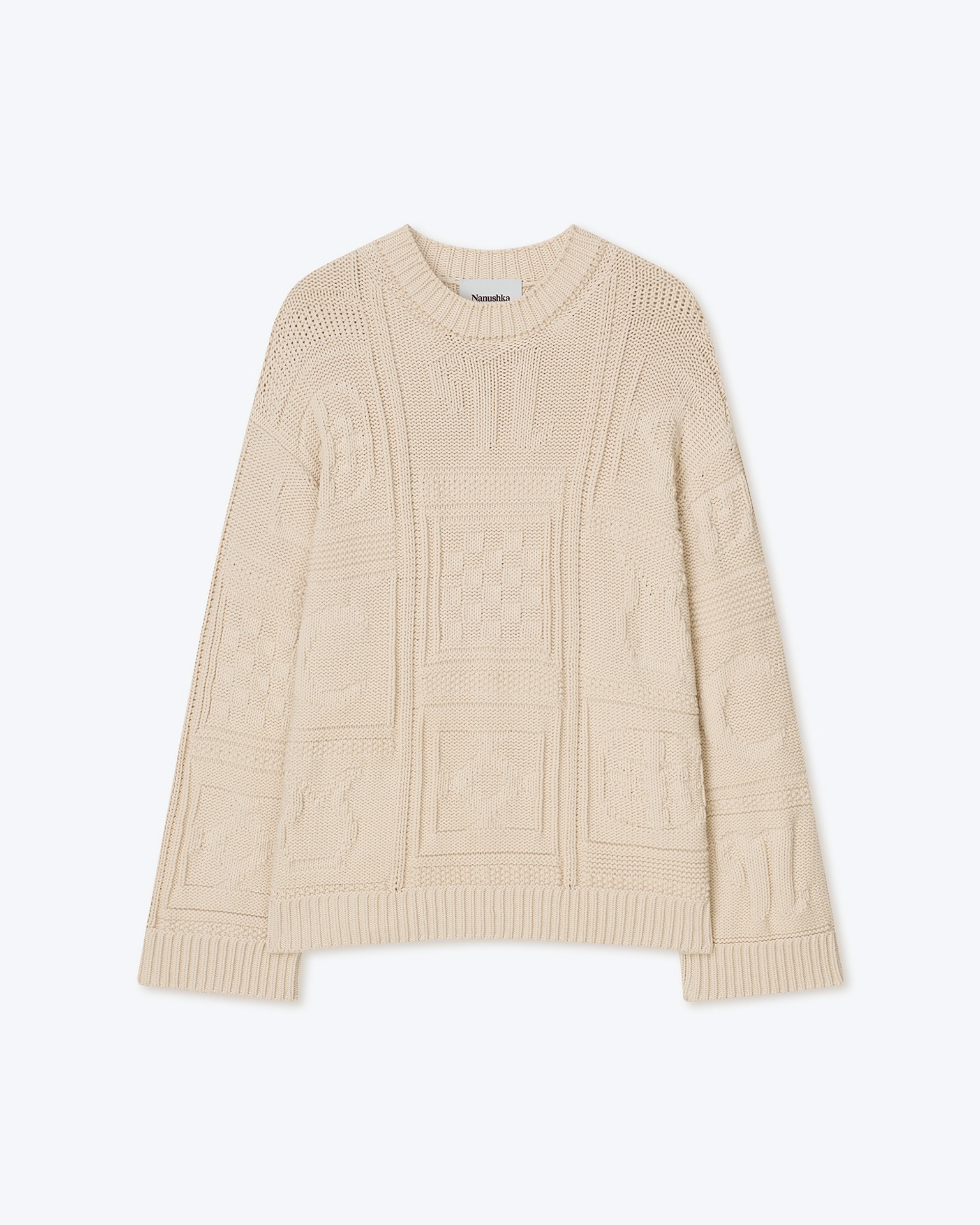 The Nicolle sweater is knitted from a blend of cotton for breathable warmth. It has a V-neck silhouette and is decorated with patterns inspired by traditional Hungarian Kopjafa – totems carved with symbols from an intricate system of motifs. Ribbed trims define the loose fit. Shell 55% ORGANICALLY GROWN COTTON 45% POLYAMIDE