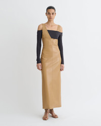 The Ferriti dress demonstrates our love of fabric blocking. It’s crafted from our innovative Okobor™ alt-leather for a close fit with flattering ruching, and finished with soft wool jersey at the halter neckline for a subtle contrast. Fit Tailored to be fitting against the body. Materials and Care Shell: Shell1: 100% Wool, Shell2: 100% Polyester (Recycled), Shell3: 100% Polyurethane Do not wash, do not bleach, do not tumble dry, do not iron, gentle dry clean any solvent except trichloroethylene Handle with care to ensure garment lifespan. Repair or resell to support circular fashion. This product is made from a delicate fabric and has a special finish, The dark colour of this product may transfer onto light surfaces and cause damage. Please store separately and handle with care.