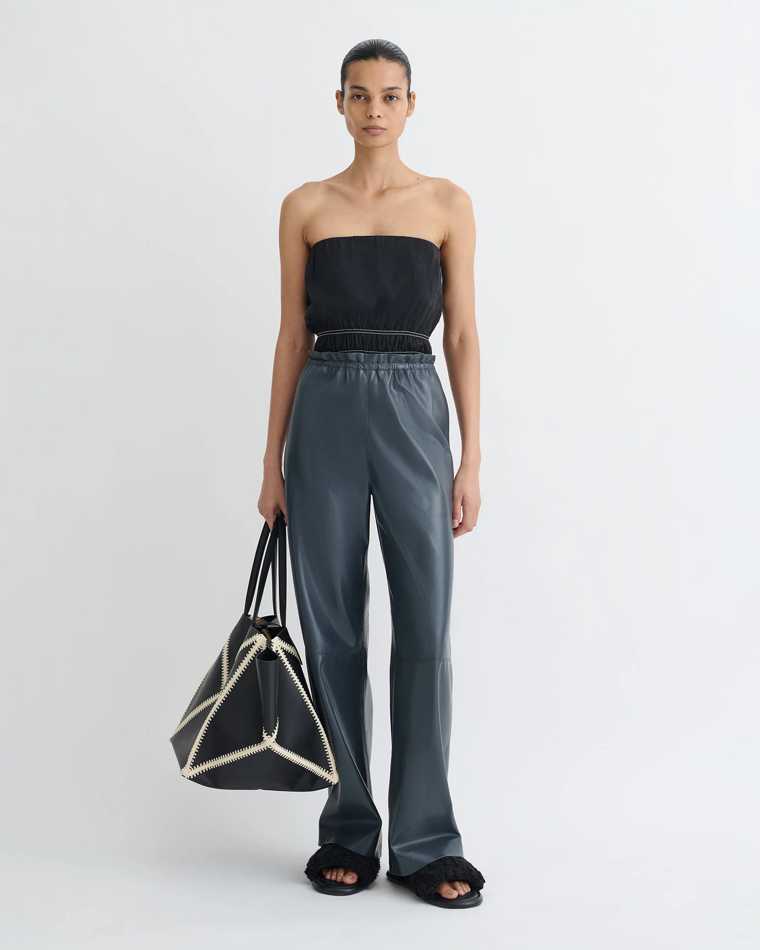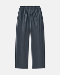 The Geb pants are made from our innovative Okobor™ alt-leather that’s gathered along the high waist. They fall to the floor in relaxed legs and come in a cool steel-blue tone. Fit Standard fit, matches usual sizing. Materials and Care Shell: Shell1: 100% Polyester (Recycled), Shell2: 100% Polyurethane Do not wash, do not bleach, do not tumble dry, do not iron, gentle dry clean any solvent except trichloroethylene Handle with care to ensure garment lifespan. Repair or resell to support circular fashion. This product is made from a delicate fabric and has a special finish, The dark colour of this product may transfer onto light surfaces and cause damage. Please store separately and handle with care.