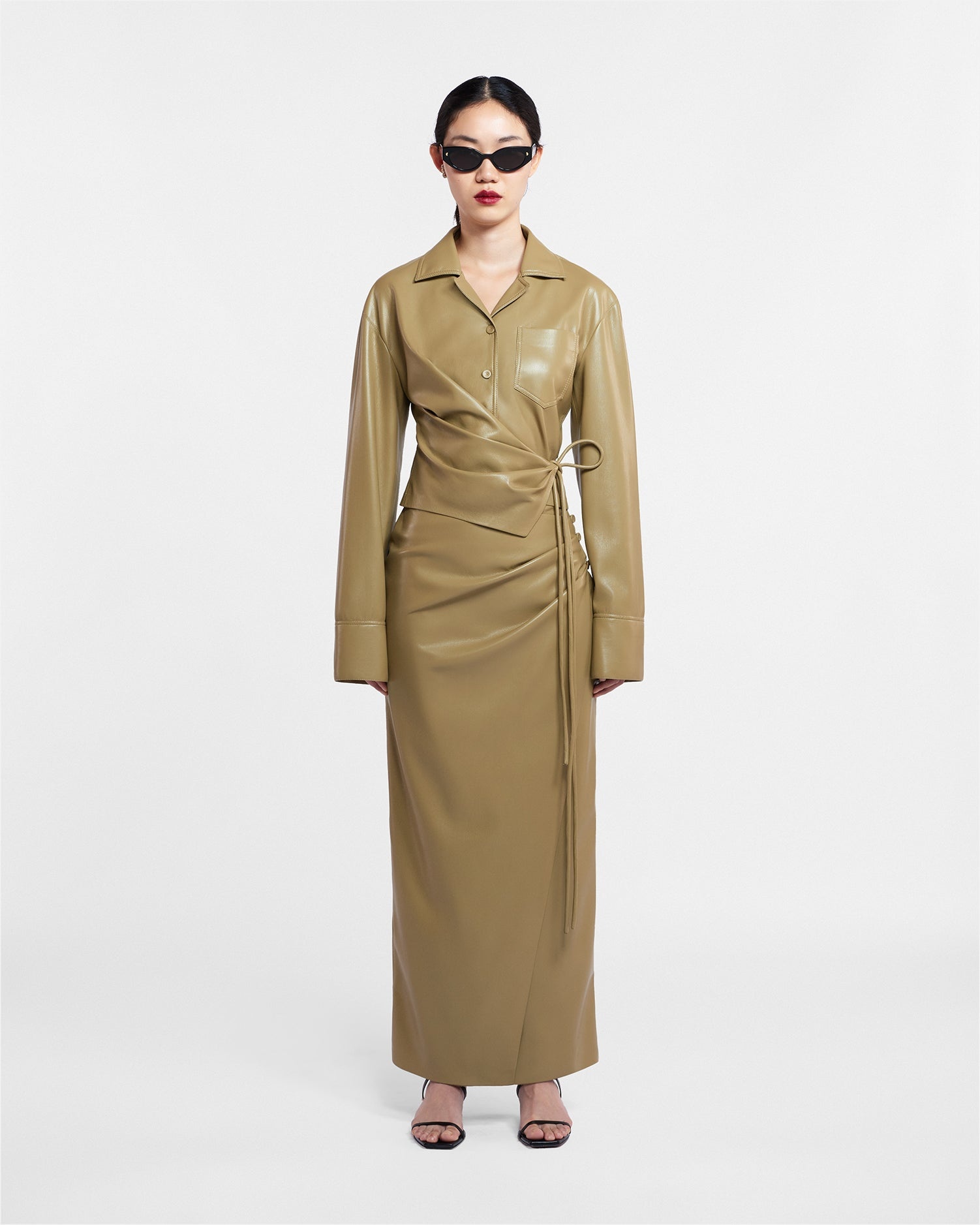 The Merano shirt is a cool, contemporary take on classic tailoring. Made from our signature OKOBOR™ alt-leather, it combines a button-fastening placket with a draped wrap front. Materials and Care Shell: Coating: Polyurethane Base: 100% Polyester Recycled Do Not Wash, Do Not Bleach, Do Not Tumble Dry, Do Not Iron, Dry Clean Any Solvent Except Trichloroethylene, The Dark Colour Of This Product May Transfer Onto Light Surfaces And Cause Damage