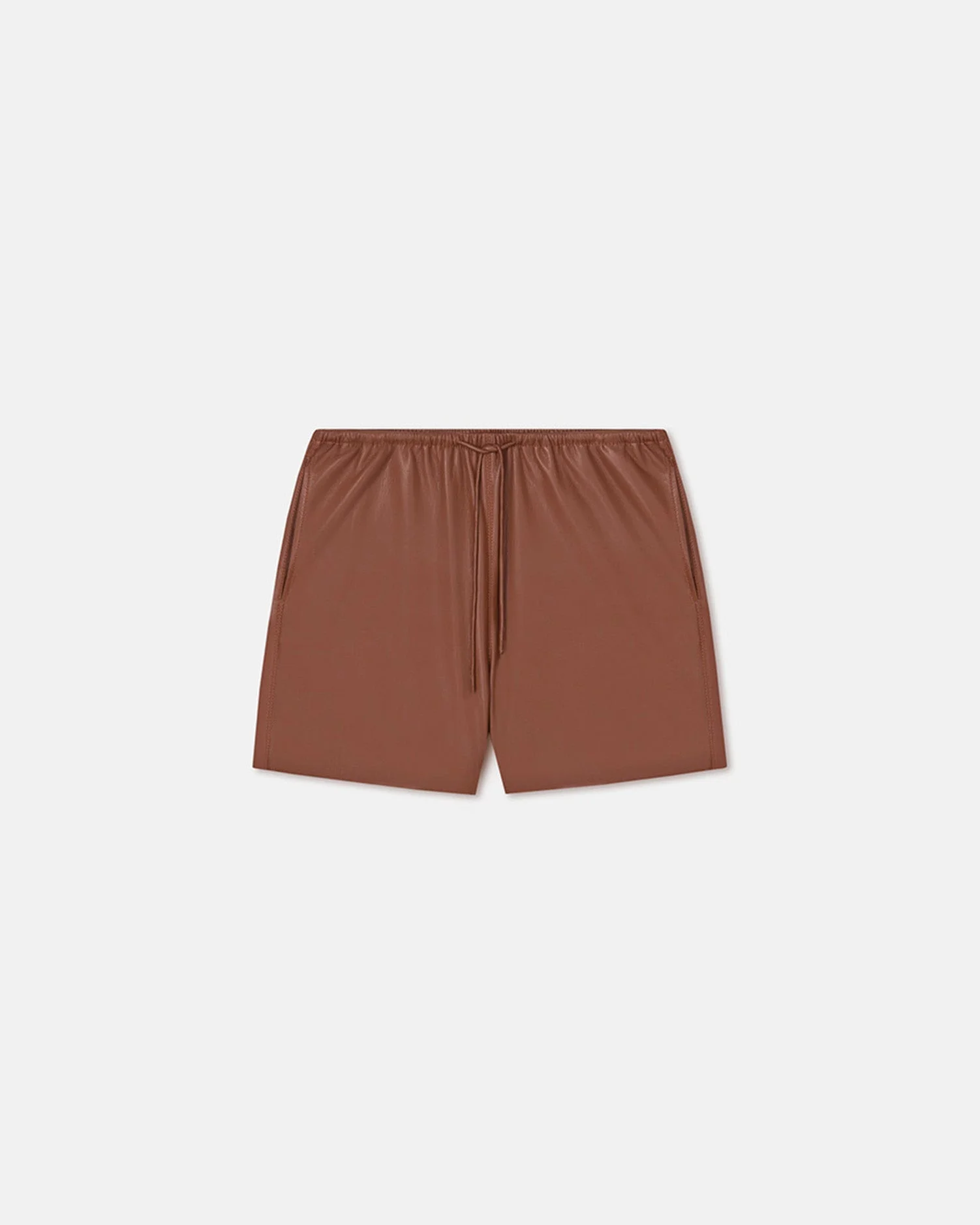 The Aniela shorts are crafted from our exclusive OKOBOR™ alt-leather fabric in a new henna tone – it’s statement making but easy to style. They sit high on the waist with drawstring ties for flexibility. Fit Standard fit, matches usual sizing. Materials and Care Shell: Base: 100% Polyester (Recycled), Coating: 100% Polyurethane Do not wash, do not bleach, do not tumble dry, do not iron, dry clean any solvent except trichloroethylene. Handle with care to ensure garment lifespan. Repair or resell to support circular fashion. This product is made from a delicate fabric and has a special finish, the dark color of this product may transfer onto light surfaces and cause damage. Please store separately and handle with care.