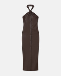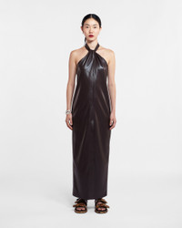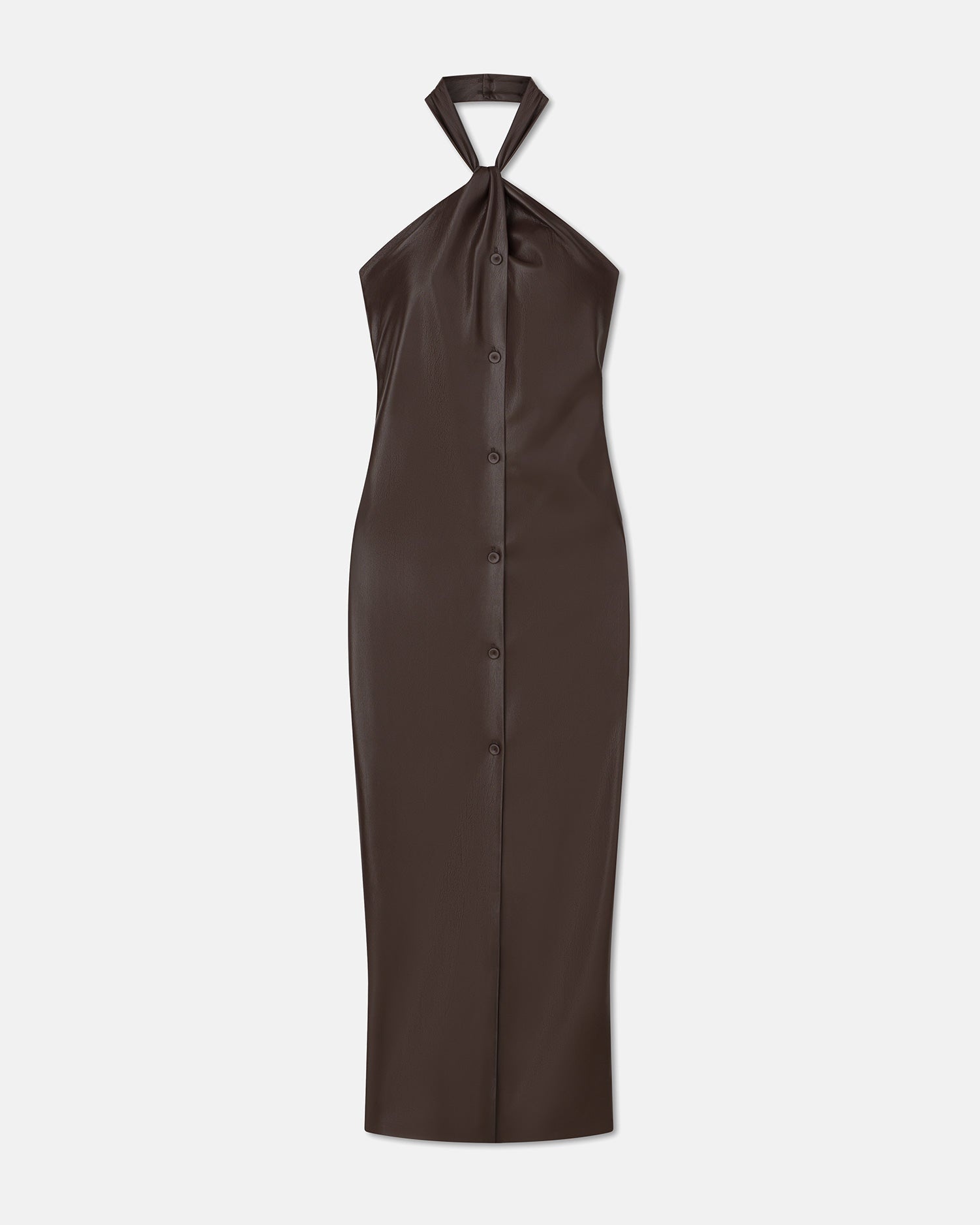 The Elima dress takes on a more structured silhouette when crafted from our signature OKOBOR™alt-leather. It’s crafted to fall from a soft halter neckline to an ankle-length hem, with press-studs to fasten the center-front split. Materials and Care Shell: Coating: Polyurethane Base: 100% Polyester Recycled Do Not Wash, Do Not Bleach, Do Not Tumble Dry, Do Not Iron, Dry Clean Any Solvent Except Trichloroethylene, The Dark Colour Of This Product May Transfer Onto Light Surfaces And Cause Damage