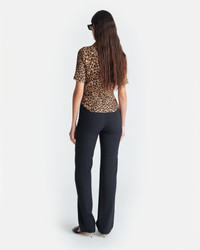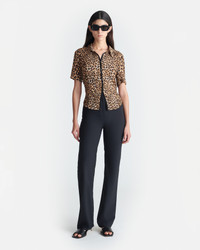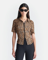The Clare shirt is made from our lightweight 60s pleat fabric. Decorated with an ocelot print, it has a slim-fitting, short-sleeved silhouette. Maximise the impact of the pattern with the coordinating Zarina skirt. Fit Standard fit, matches usual sizing. Materials and Care Shell: 99% Viscose 1% Elastane Machine wash warm (30°) permanent press, do not bleach, do not tumble dry, iron low heat (110°), dry clean any solvent except trichloroethylene, dry flat, do not wring. Handle with care and wash less to ensure garment lifespan. Repair or resell to support circular fashion.