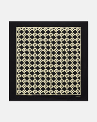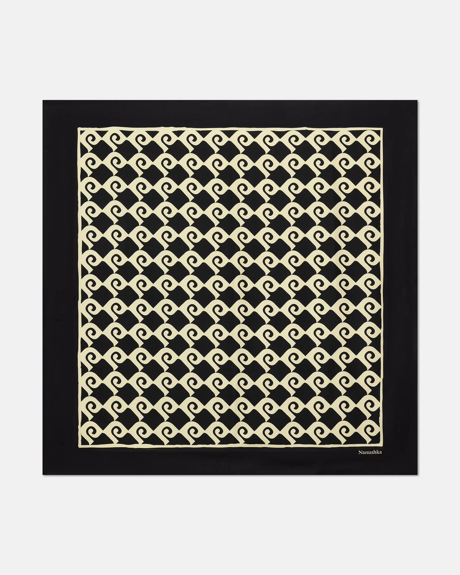 The Shoul scarf is updated with our signature black and beige Kopjafa symbol print. Made from soft and light twill silk, the scarf has the multipurpose ability to be worn on your head, around you neck, or even looped around the top handle of your handbag. Dimensions 127x127(cm) Materials and Care Shell: 100% Silk Do not wash, do not bleach, do not tumble dry, do not iron, dry clean any solvent except trichloroethylene. handle with care to ensure garment lifespan. repair or resell to support circular fashion.