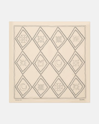 The Miani scarf is decorated with a Symbol Argyle print, an array of motifs inspired by traditional Hungarian kopjafa motifs. Made from silk, it can be styled endlessly, from around the neck and shoulders to looped round the handle of a tote. Dimensions: 127x127 (cm) Materials and Care Shell: 100% Silk Do not wash, do not bleach, do not tumble dry, do not iron, do not dry clean Handle with care to ensure garment lifespan. Repair or resell to support circular fashion.