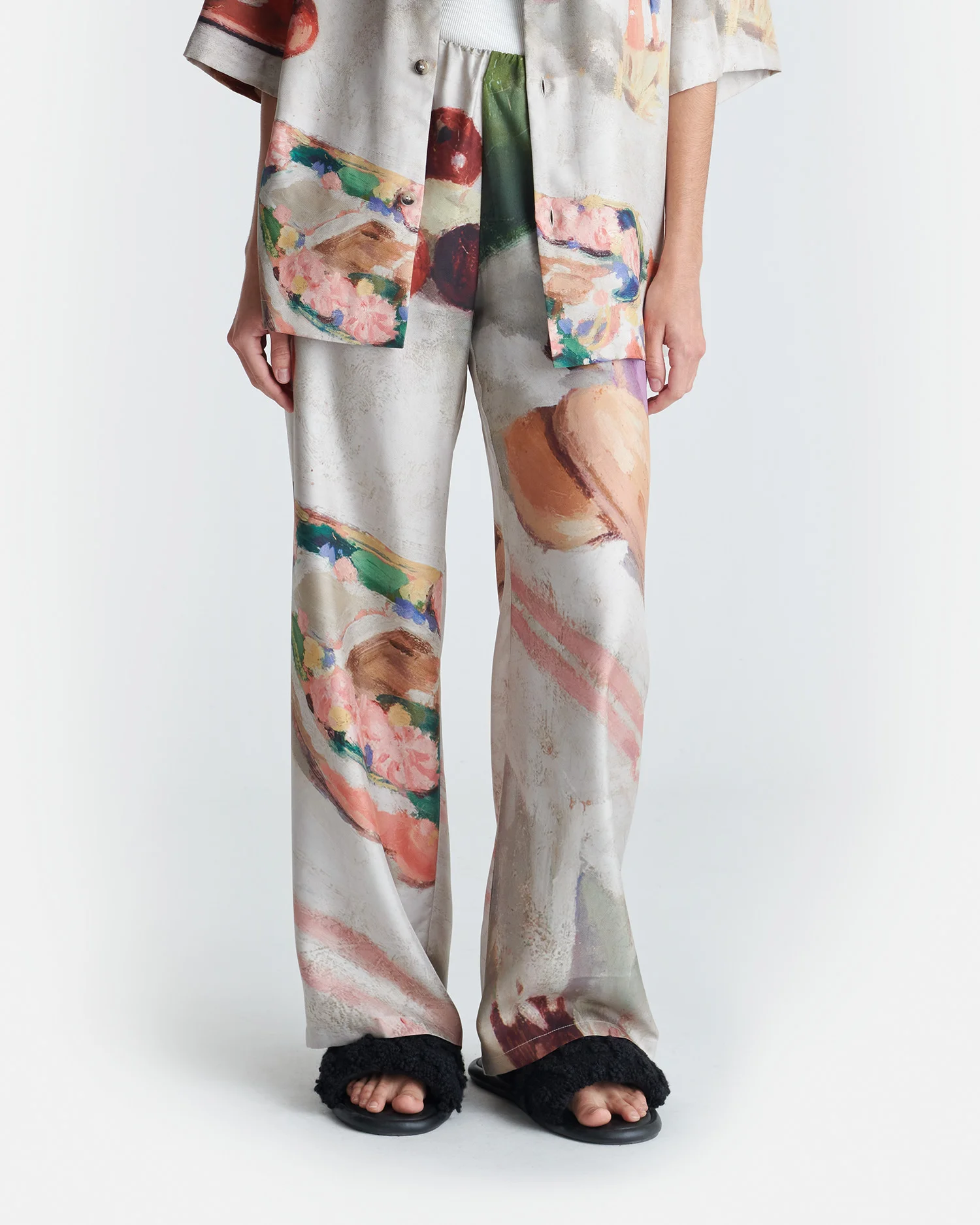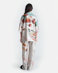 The Brenda pants are printed with the Gingerbread Heart painting by Hungarian artist Adolf Fenyes. The style is striking yet easy to wear thanks to the elasticated waist and relaxed legs. This piece is part of the exclusive Adolf Fenyes capsule - a celebration of the artist's legacy, showcased through a curated selection of his still-life paintings. Adolf Fenyes, Still Life with Gingerbread Heart, 1907, Hungarian National Gallery Fit Standard fit, matches usual sizing. Model is 177 cm (5'9") and wears a size S. Materials and Care Shell: 100% Silk Do not wash, do not bleach, do not tumble dry, do not iron, dry clean any solvent except trichloroethylene. Handle with care to ensure garment lifespan. Repair or resell to support circular fashion.