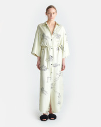The Damala dress has a timeless shirt silhouette made from luxuriously lightweight silk twill. It’s decorated with our new-season Folktale print, a subtly expressive array of motifs, and has an oversized silhouette defined by wide sleeves and a waist-cinching belt. Fit Intentionally designed for an oversized look. Materials and Care Shell: 100% Silk Do not wash, do not bleach, do not tumble dry, do not iron, dry clean any solvent except trichloroethylene. Handle with care to ensure garment lifespan. Repair or resell to support circular fashion.