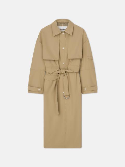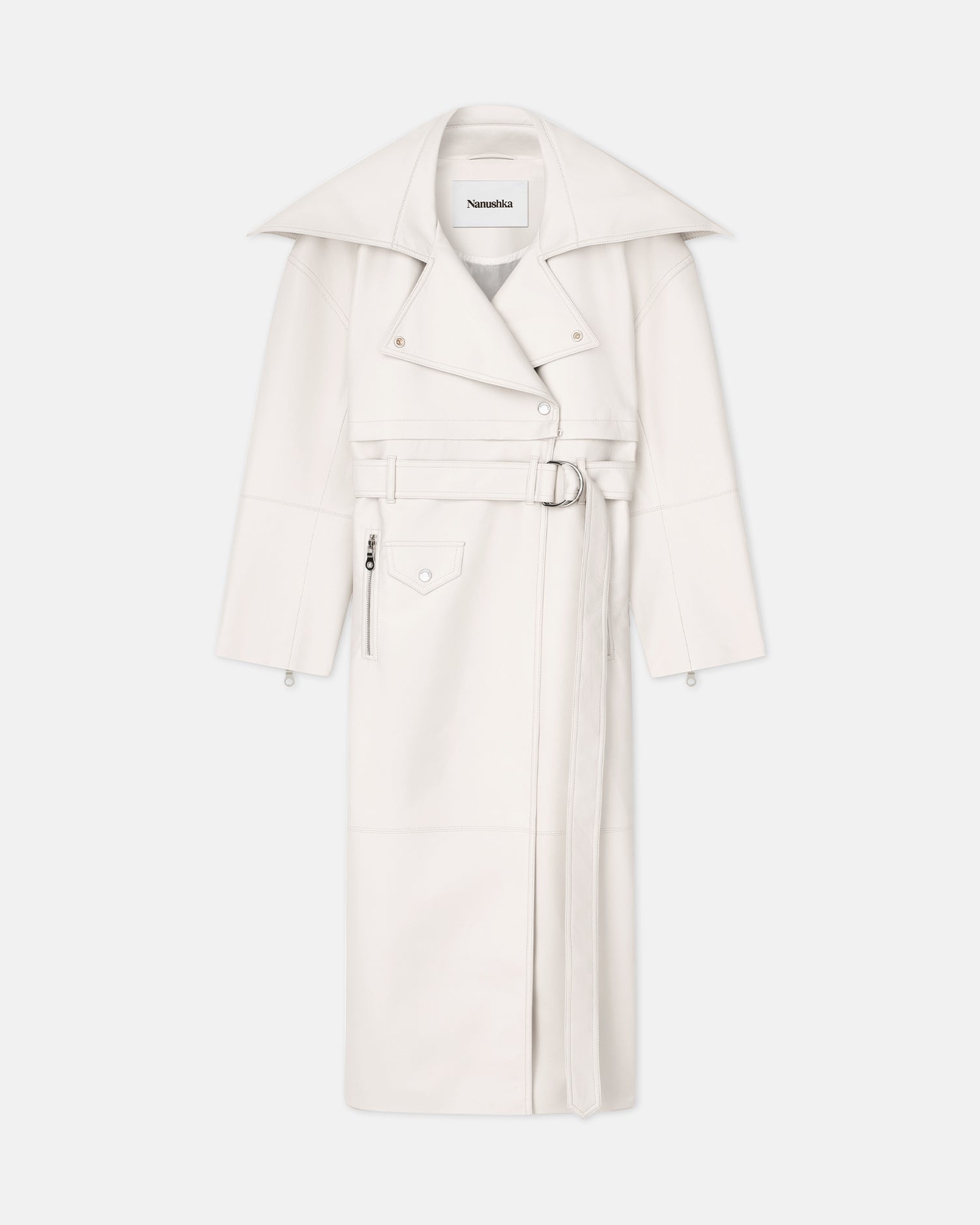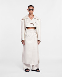 Innovative craft, new heritage and a bohemian spirit are our core design principles. A hybrid of classic trench and biker styles, the Mariella coat is crafted from regenerated leather. It is further distinguished by an exaggerated shawl collar, wide cuffs and a belt at the waist. Zip to transform into a cropped jacket or a leather skirt. Fit Designed to be intentionally oversized. Take your usual size for the oversized effect, or take a size down for a more regular fit. Model is 175 cm (5'9") and wears size S. Materials and Care Shell: Coating: Polyurethane Base: 100% Polyester Back: Bonded Leather Middle: 80% Polyester 20% Polyamide Machine wash cold (20°), do not bleach, do not tumble dry, do not iron, do not dry clean