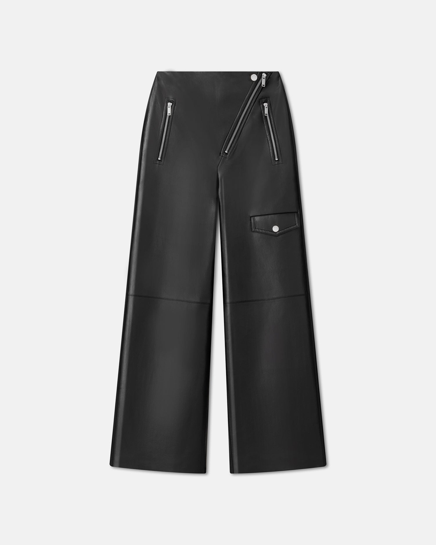The Hayes pants are a cool and confident deconstruction of classic biker styles. They are made from soft and supple regenerated leather for a straight-leg fit, and finished with an array of zip trims and a snap-fastening pocket. Fit Standard fit, matches usual sizing. Model is 175 cm (5'9'') and wears a size S. Materials and Care Shell: Base: 100% Polyester Coating: Polyurethane Back: Bonded Leather Middle: 80% Polyester 20% Polyamide Do not wash, do not bleach, do not tumble dry, do not iron, dry clean any solvent except trichloroethylene handle with care to ensure garment lifespan. repair or resell to support circular fashion.