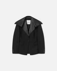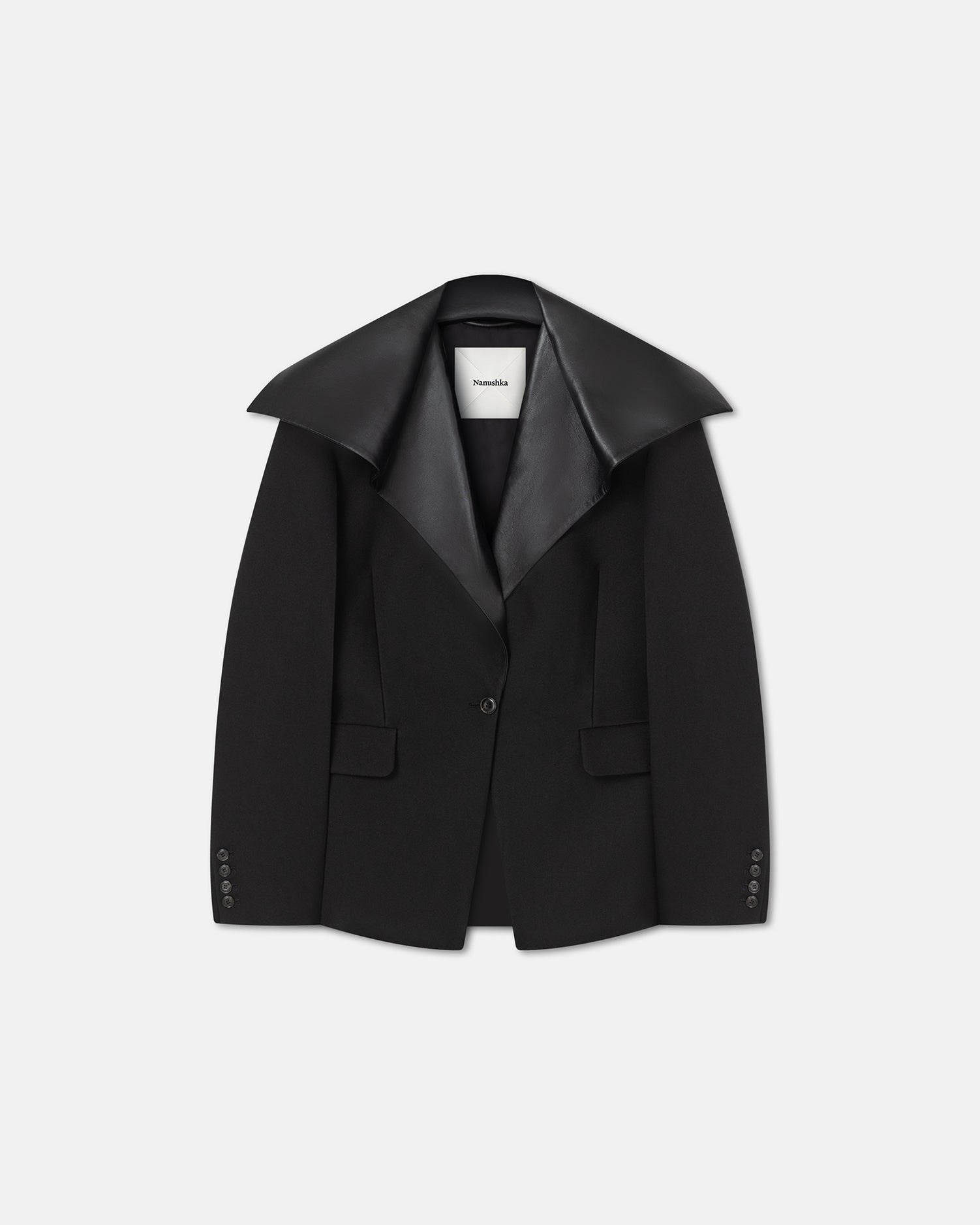 The Luiza jacket embodies our modern vision for tailoring. Made from classic black suiting fabric, it is detailed with a regenerated leather shawl collar that leads the eye down to the flattering cinched-in waist. Materials and Care Shell 1: 100% Polyester, Shell 2: Base: 100% Polyester Coating: 100% Polyurethane Back: Bonded Leather Middle: 80% Polyester 20% Nylon Do not wash, do not bleach, do not tumble dry, iron low heat (110°), gentle dry clean any solvent except trichloroethylene, do not wring. Handle with care to ensure garment lifespan. Repair or resell to support circular fashion.