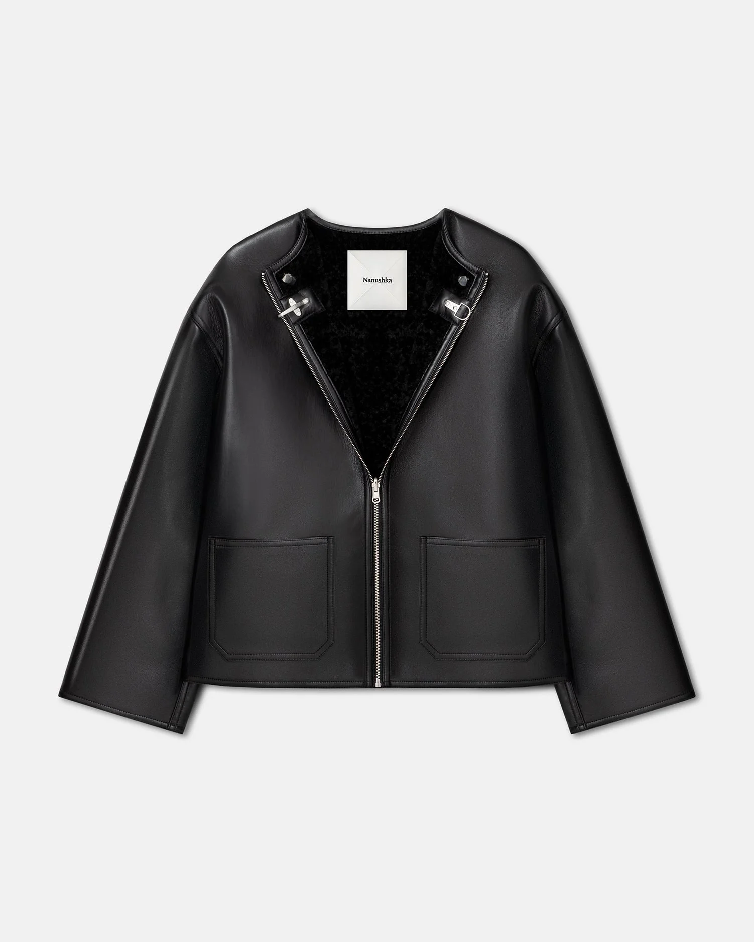 The Panka jacket is crafted from bonded shearling – switch between the smooth and textured sides for styling versatility. The hook and buckle fastenings and zip-up details reference classic Biker designs. Fit Standard fit, matches usual sizing. Model is 177 cm (5'9'') and wears a size S. Materials and Care Shell: Base1: 100% Pes (Rec) Base2: 100% Pes Coating: 100% Pu Back: Bonded Leather Middle: 80% Pes 20% Pa Hand wash cold, do not bleach, tumble dry low heat, do not iron, do not dry clean, do not wring. Handle with care and wash less to ensure garment lifespan. Repair or resell to support circular fashion.