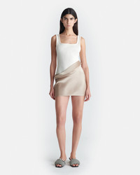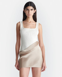 Innovative fabric stories are a Nanushka signature. The Marijn dress comprises a creme ribbed-jersey body and dune-toned slip satin skirt – the asymmetric foldover waist is super flattering. Fit Tailored to be fitting against the body. Materials and Care Shell1: 86% Triacetate 14% Polyester, Shell2: 49% Cotton (Recycled) 49% Cotton (Organic) 2% Elastane Machine wash warm (30°), do not bleach, do not tumble dry, iron low heat (110°), dry clean any solvent except trichloroethylene. Handle with care and wash less to ensure garment lifespan. Repair or resell to support circular fashion.