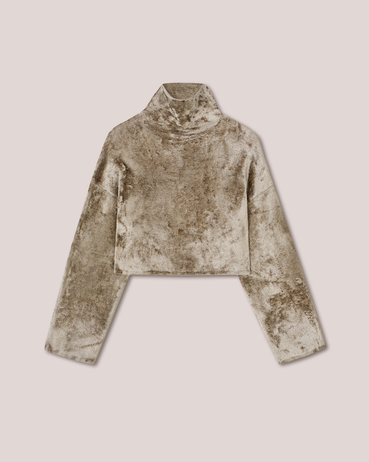 The clean lines of the Rina invoke a minimalist aesthetic. Cut to a cropped fit from our tactile viscose velour knit in champagne and finished with a funnel neck, pull it on for an easy grab-and-go option. Body: Shell 1: 85% Rayon Viscose 15% Polyamide Fibre Shell 2: 83% Nylon 17% Elastane Trimmings: 83% Nylon 17% Elastane