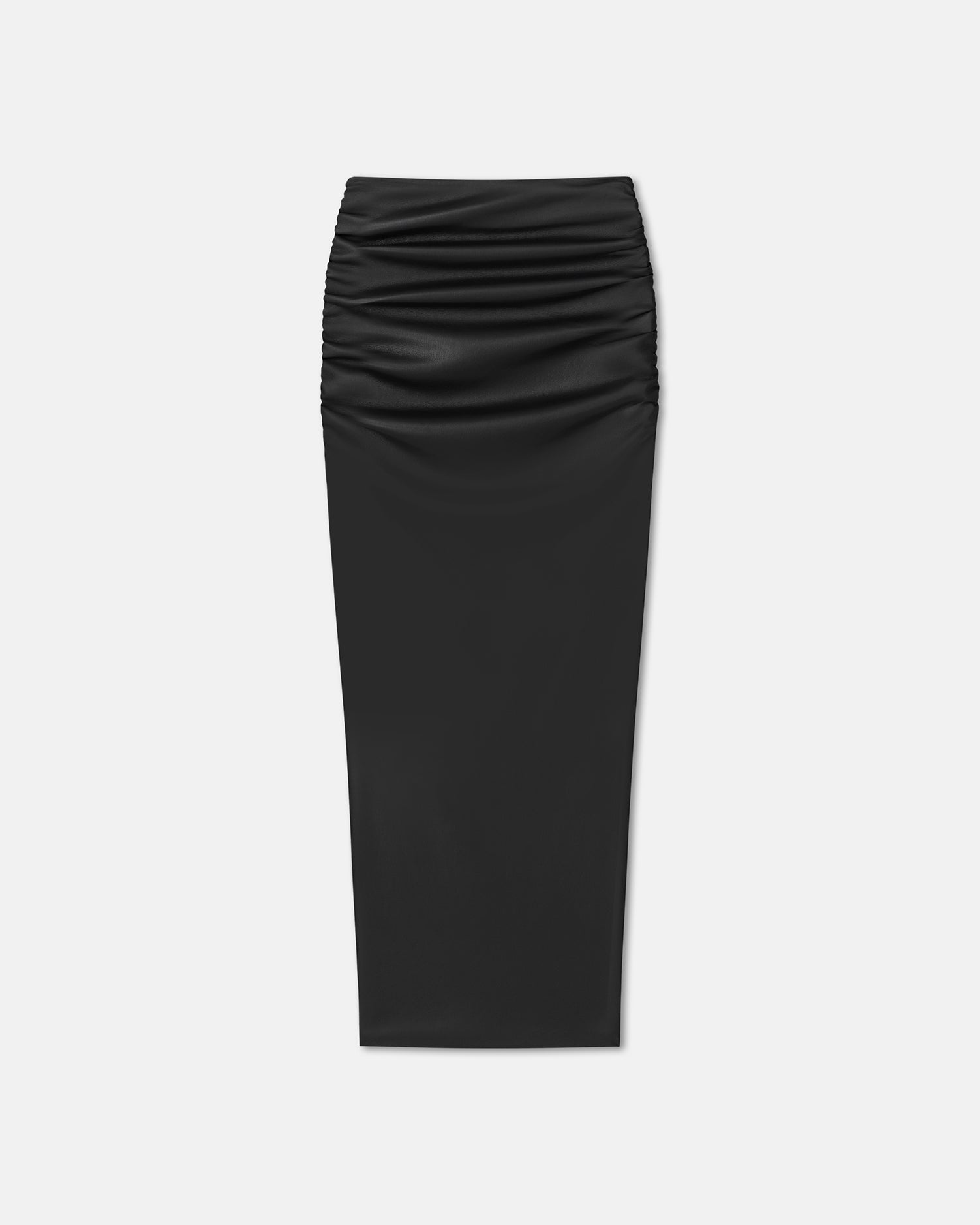 The Hester skirt is made a combination of our signature fabrics – Okobor™ alt-leather and mesh jersey – to hold the shape of the waist-flattering ruching perfectly. In classic black, it’s a timeless wardrobe foundation with an elevated aesthetic. Fit Close to the body: Designed to fit sleekly against the body. Mid-length skirt Okobor material on the front Mesh jersey material on the back Slit on the back Body fitting Model is 174 cm (5'9'') and wears a size S. Materials and Care Shell 1: Base: 100% Polyester (Recycled), Coating: Polyurethane Shell 2: 100% Polyester (Recycled) Do not wash, do not bleach, do not tumble dry, do not iron, dry clean any solvent except trichloroethylene. this product is made from a delicate fabric and has a special finish, the dark colour of this product may transfer onto light surfaces and cause damage, please store separately and handle with care..handle with care to ensure garment lifespan. repair or resell to support circular fashion.