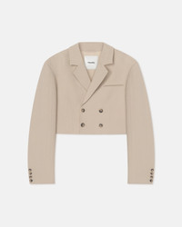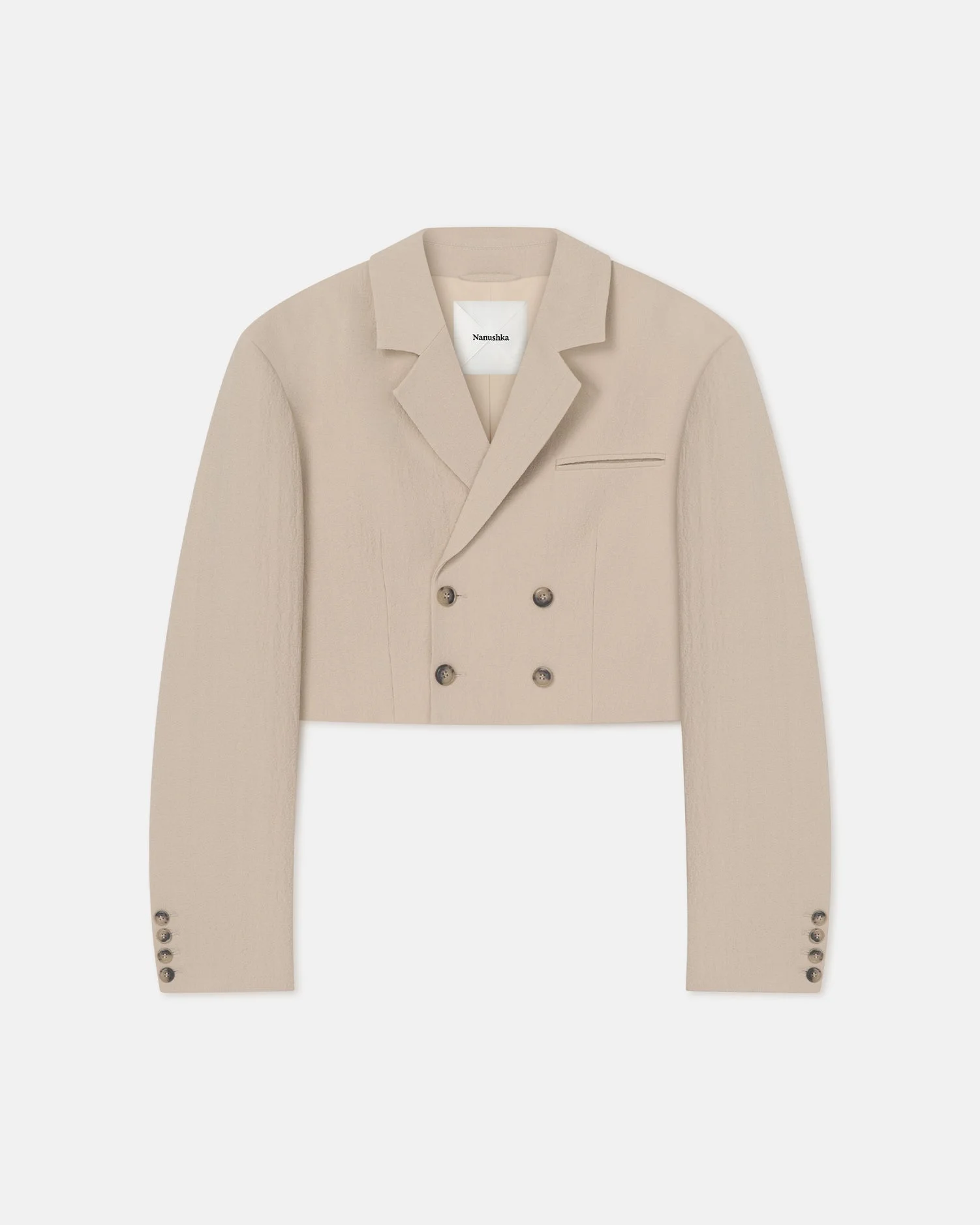 Nanushka’s Rony Blazer reimagines tailoring with a sculptural clarity. Made from seersucker suiting, this boxy cropped double-breasted blazer sharpens the shoulders. Fit Standard fit, matches usual sizing Materials and Care Shell: 98% VISCOSE 2%ELASTANE Lining: 100% CUPRO Do not wash, Do not bleach, Do not tumble dry, Do not iron, Gentle Dry clean any solvent except Trichloroethylene