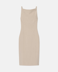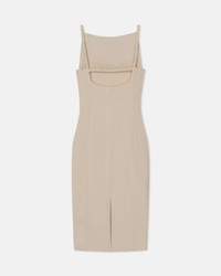 Nanushka’s Vittoria Dress refines feminine tailoring with a sculptural take. Cut from seersucker suiting, this square-neck midi dress features slender shoulder straps and an open back for subtle sensuality. In a soft sand hue, it is an elegant piece with enduring impact. Fit Tailored to be fitting against the body. Model is 175 cm (5'9") and wears a size S. Materials and Care Shell: 98% VISCOSE 2%ELASTANE Lining: 100% CUPRO Do not wash, Do not bleach, Do not tumble dry, Do not iron, Gentle Dry clean any solvent except Trichloroethylene