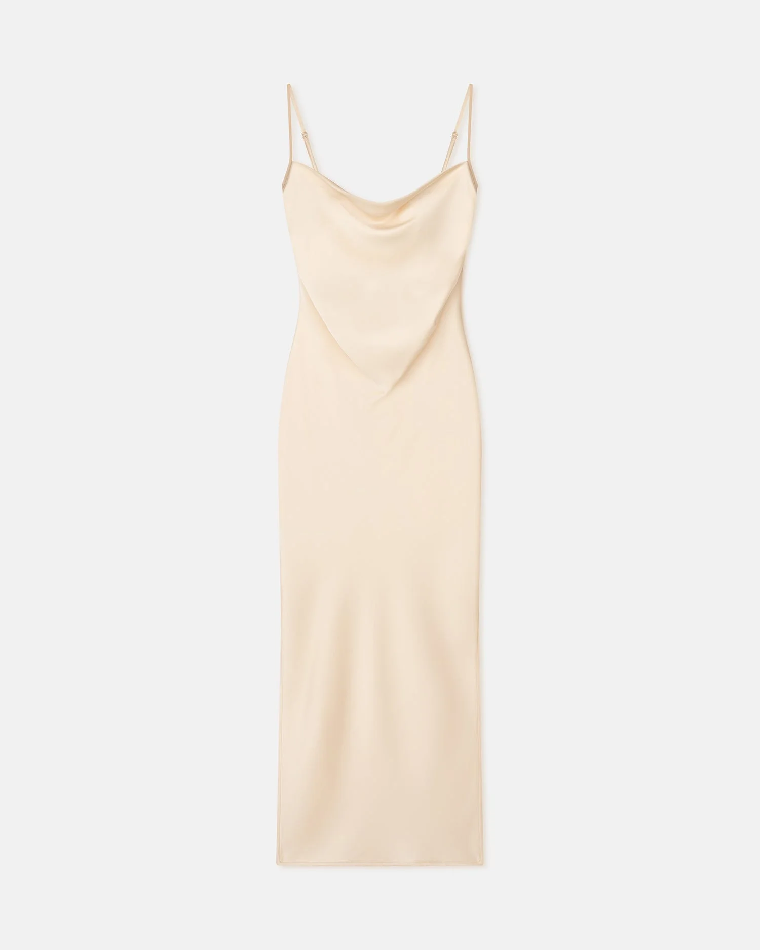 Made from signature slip satin, the cowl neckline and delicate spaghetti straps are tied together to the perfect ankle length, making the Macia dress a Nanushka classic. Fit Regular fit, true to size. Materials and Care Shell: 81% Acetate 19% Polyester (recycled) do not wash, do not bleach, do not tumble dry, iron low heat (110°), dry clean any solvent except trichloroethylene