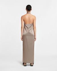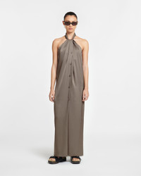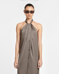 The Elima dress is cut to fall loosely around the body from a halter neckline. It gently opens at the waist, making it ideal for layering over pants. Materials and Care Shell: 81% Acetate 19% Polyester Do not wash, Do not bleach, Do not tumble dry, Iron low heat (110°), Dry clean any solvent except Trichloroethylene