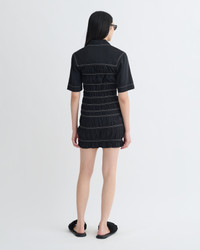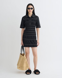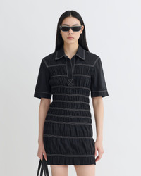 The Nomia dress showcases a new silhouette for Pre-Fall 2025. Playful yet polished, formal yet sports-inspired, it is made from shiny glass poplin with contrasting white stitching, a smocked waist and polo neck. Fit Standard fit, matches usual sizing. Materials and Care Shell: 74% Viscose 26% Polyester Detail: Smocking Thread: 100% Spun Polyester Machine wash warm (30°) permanent press, do not bleach, do not tumble dry, iron low heat (110°), dry clean any solvent except trichloroethylene, do not wring Handle with care and wash less to ensure garment lifespan. Repair or resell to support circular fashion.