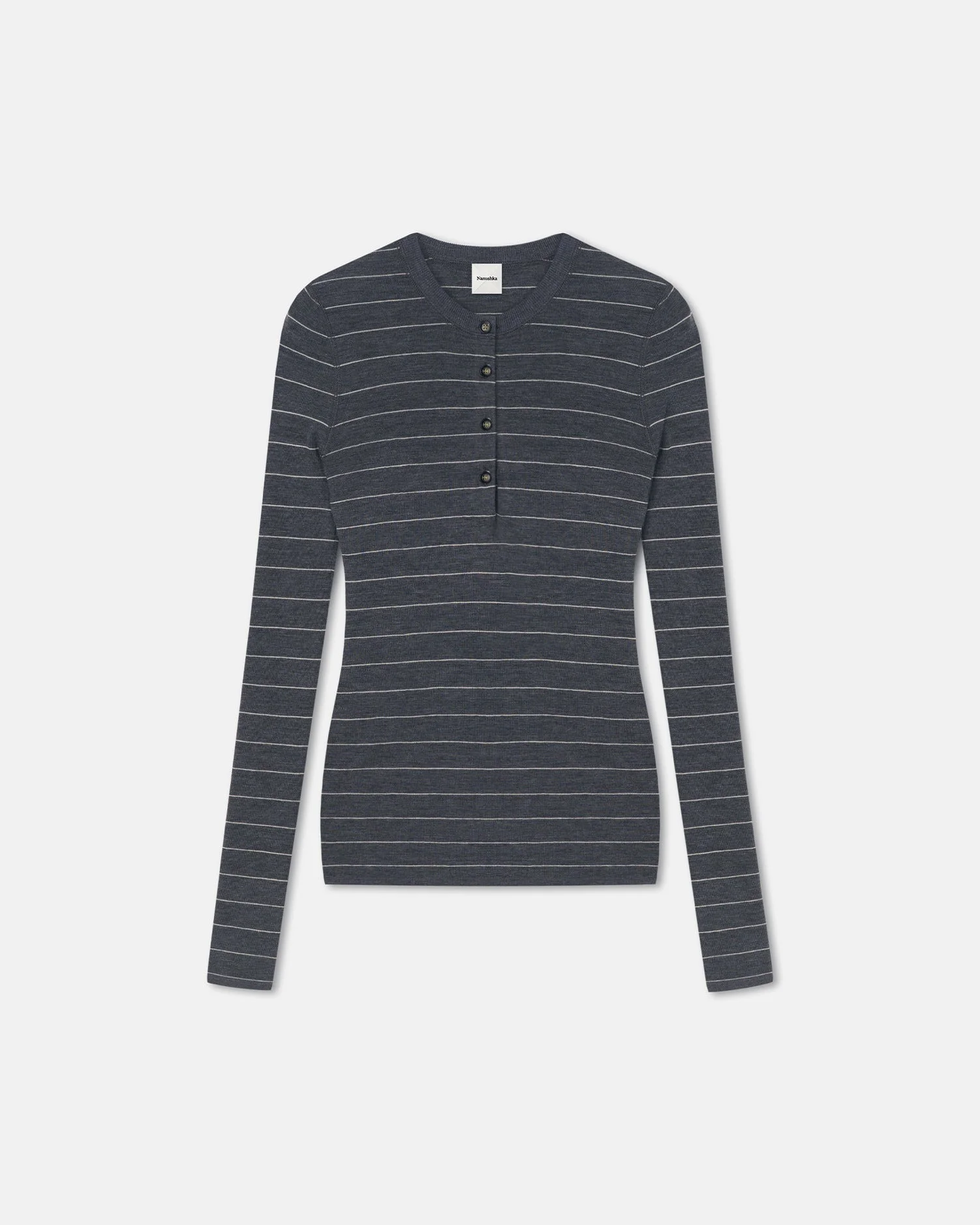 The Ariyah top takes inspiration from sports aesthetics. Made from super-soft terry merino, it has fine grey stripes and a henley silhouette. Fit Tailored to be fitting against the body. Materials and Care Shell 1: Merino Shell 2: 44% Cotton 53% Polyamide 3% Elastane Hand wash, do not bleach, do not tumble dry, iron low heat (110°), dry clean any solvent except trichloroethylene, dry flat, do not wring Handle with care and wash less to ensure garment lifespan. Repair or resell to support circular fashion.