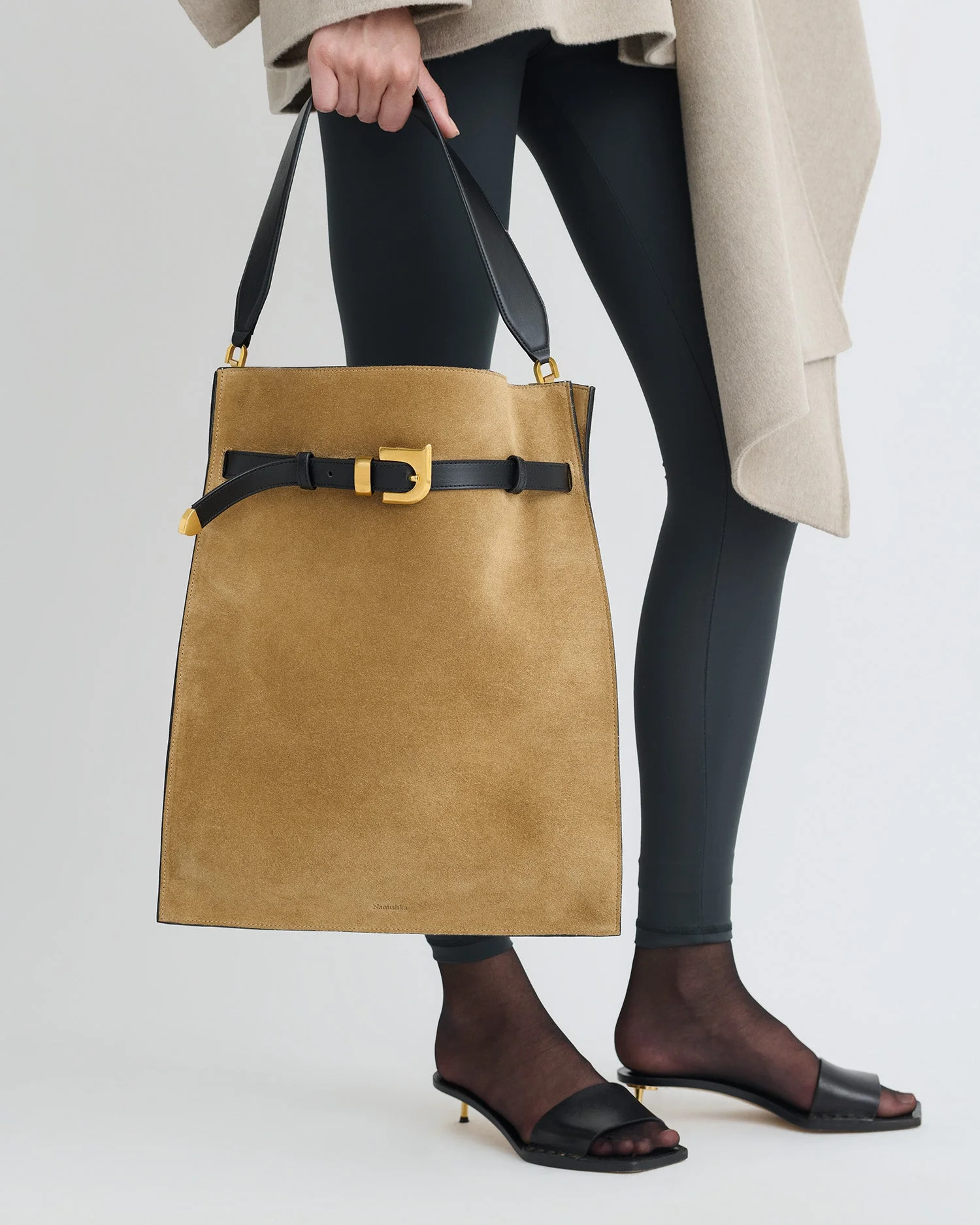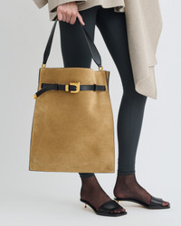 The Harmonica Maxi Bag by Nanushka is a new statement accessory. It blends sculptural structure with soft tactility. Made from brown suede, this north–south silhouette features a signature buckle and elongated proportions. Materials and Care Shell: 100% Leather, Lining: 100% Leather, Hardware: 100% Zamak "The HARMONICA Bag is carefully made in Italy with genuine suede. As there are natural elements to the suede, there may be slight differences, such as small marks, variations in color, and veins. Take extra care as dyed suede may produce crocking or bleeding when in contact with light-colored or wet surfaces.To preserve the life and quality of your bag, here are some suggestions to follow: Avoid contact with water, cosmetic products, perfumes and oily substances. Avoid any prolonged exposure to intense sources of light or heat. Take care not to scratch it against abrasive surfaces. Do not keep it in a wet, hot or unventilated area. Protect the bag by keeping it in its protective dust bag, never in a plastic bag."