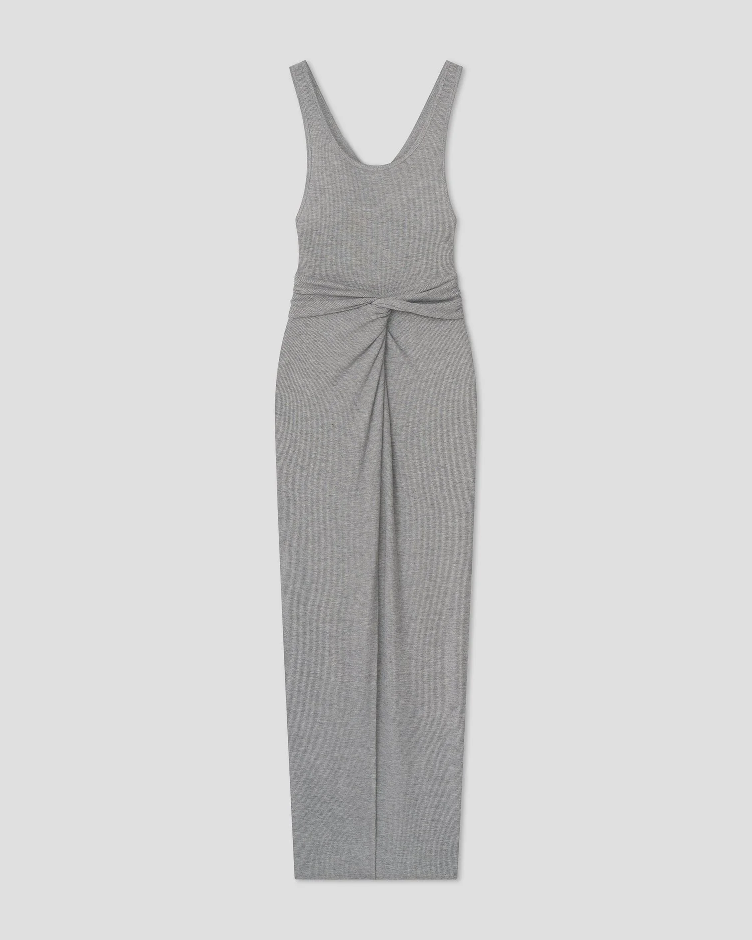 The Ofelia dress explores ease through a fluid rib construction and softly sculpted shape. Designed to sit close to the body, it features a tank-style upper and a sarong-inspired twist at the waist that creates gentle drape through the skirt. In grey melange, it feels pared-back and refined with an understated sense of movement. Fit Tailored to be fitting against the body. Materials and Care Shell: 95% VISCOSE 5% ELASTANE Hand wash, Do not bleach, Do not tumble dry, Iron low heat (110°), Dry clean any solvent except trichloroethylene