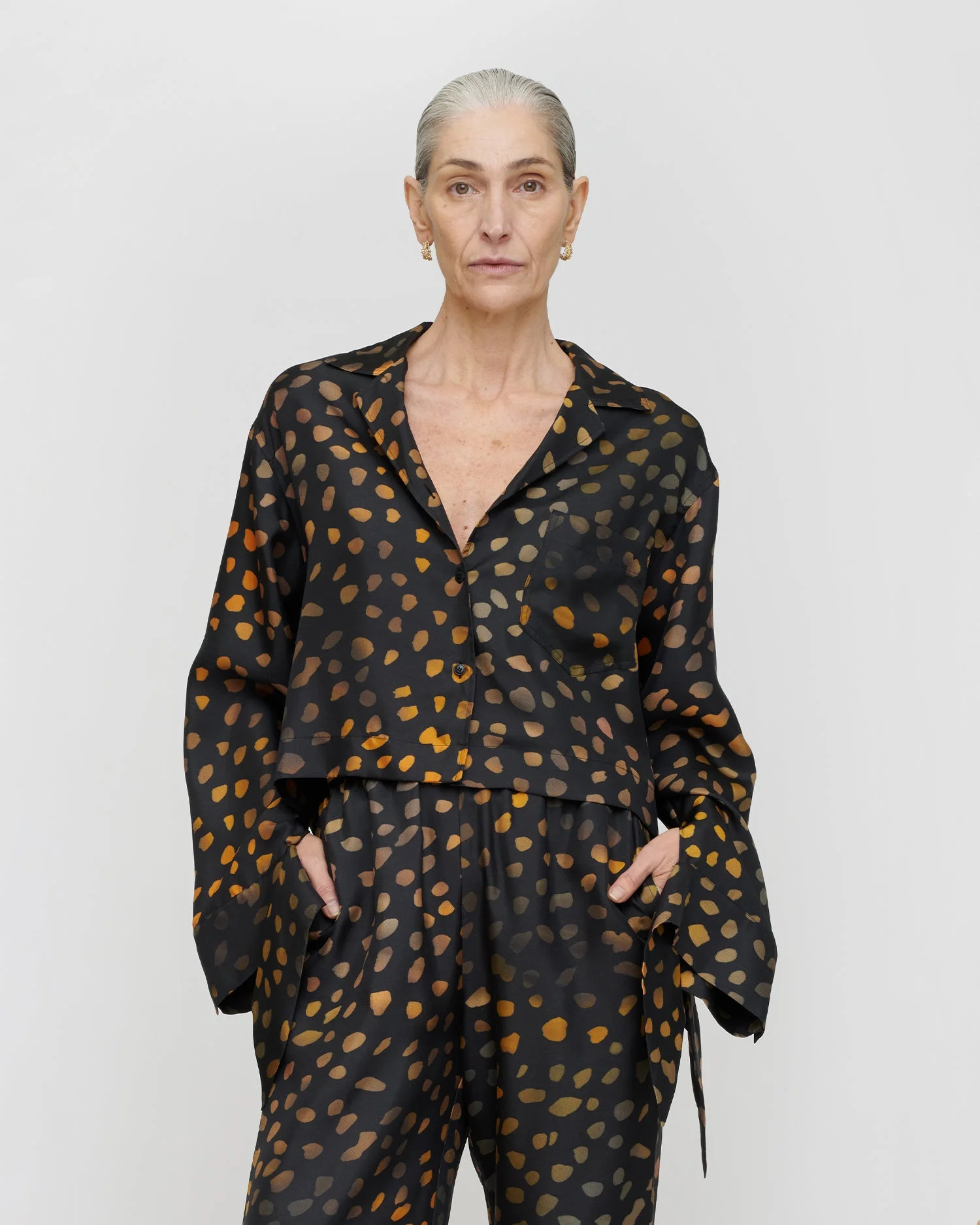 Cut to a clean silhouette, made in Twill silk, the NELIDA Piece in moonlit dots captures the collection’s play of light and texture. Featuring subtle tie detailing for adjustable nuance, it elevates everyday dressing with distinctive detail. With regular fit, it flatters without restriction. Fit Standard fit, matches usual sizing. Model is 173 cm (5'8") and wears a size S. Materials and Care Shell: 100% SILK Do not wash, Do not bleach, Do not tumble dry, Do not iron, Dry clean any solvent except trichloroethylene