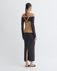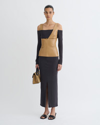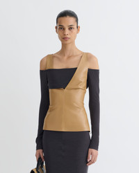 The Ferr top juxtaposes fitted oak Okobor™ alt-leather with delicate grey wool jersey – fabric blocking is a signature Nanushka technique prized for its balance of ease and elegance. Fit Tailored to be fitting against the body. Materials and Care Shell: Shell1: 100% Polyester (Recycled), Shell2: 100% Polyurethane Do not wash, do not bleach, do not tumble dry, do not iron, gentle dry clean any solvent except trichloroethylene Handle with care to ensure garment lifespan. Repair or resell to support circular fashion. This product is made from a delicate fabric and has a special finish, The dark colour of this product may transfer onto light surfaces and cause damage. Please store separately and handle with care.