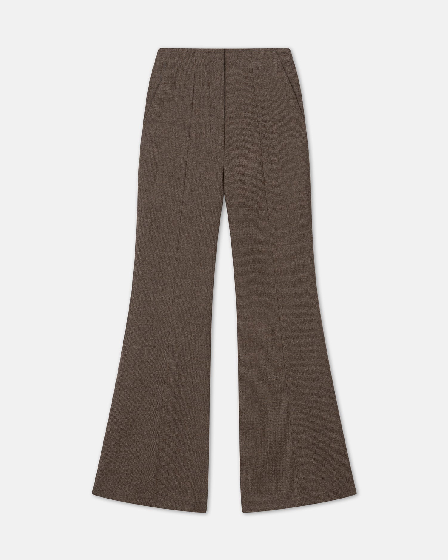 The Carillo pants are tailored from wool in a timeless walnut tone. Cut to sit high on the waist, they fall in slim legs with elegantly fluted hems. The pressed creases accentuate the contemporary silhouette. Materials and Care Shell: 100% Wool (Responsibly-Sourced) Do not wash, Do not bleach, Do not tumble dry, Iron low heat (110°), Dry clean any solvent except trichloroethylene