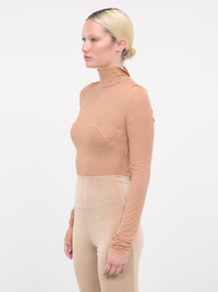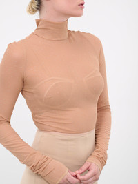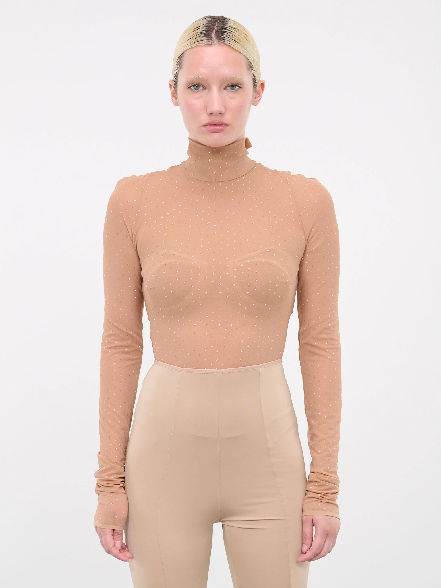 NENSI DOJAKA beige top, stretch mesh, glitter detailing, stand collar, elongated sleeves, back cut-outs, self-tie ribbon, bottom snap button fastening, fitted. Standard Sizing Model is 5'9" wearing size XS. Bust: 32" Waist: 24" Hips: 34"