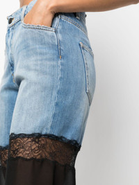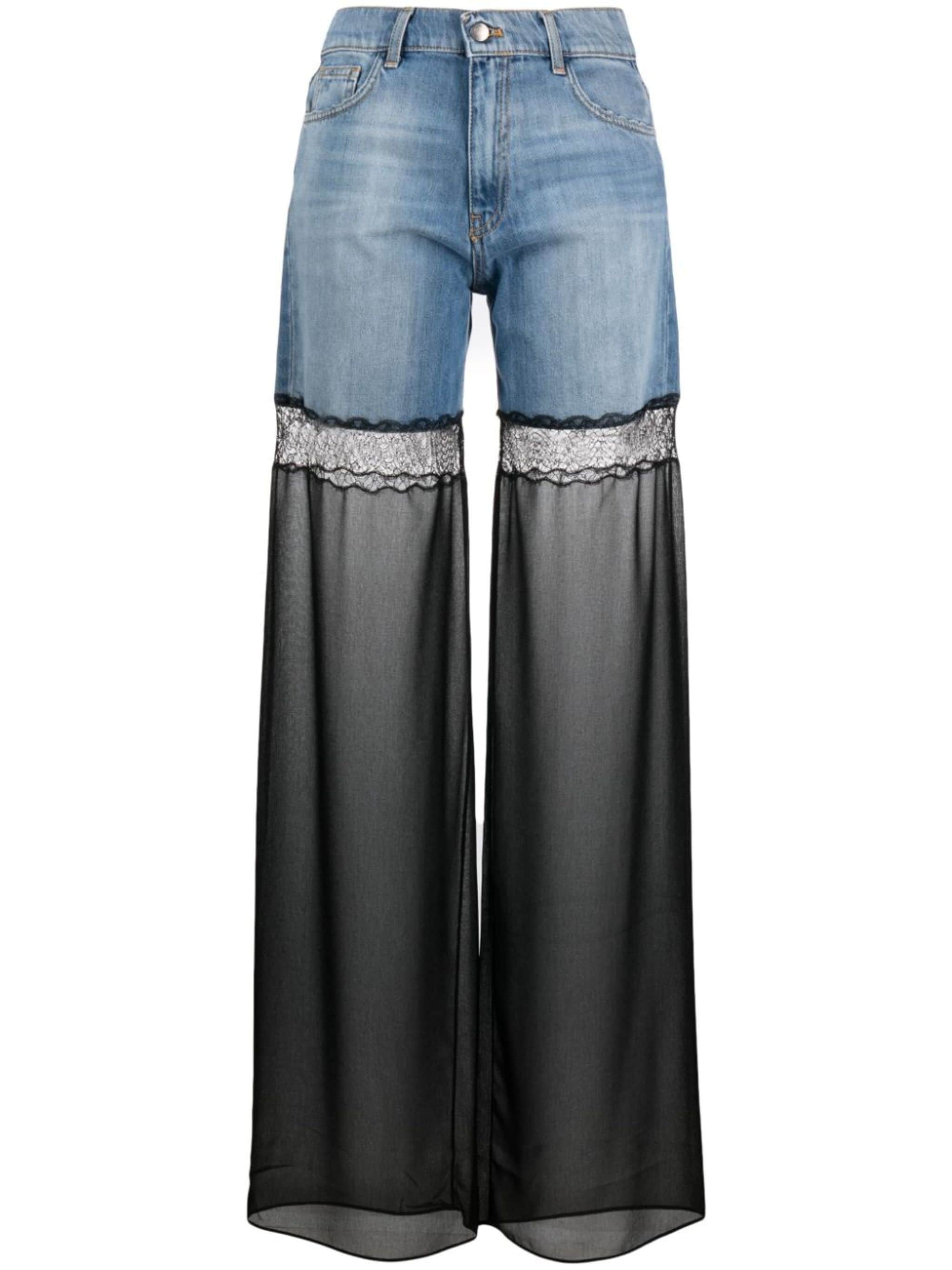 black/blue cotton denim tulle panel lace trim belt loops concealed fly and button fastening classic five pockets straight leg Size & Fit Model Measurements: Height: 1.78 m Bust/Chest: 82.0 cm Hips: 89.0 cm Waist: 61.0 cm Model wears size S Fabric and Care Designer Style ID: NDAW23DEN002 Designer Colour: BLUE/BLACK Composition: Cotton 100%, Polyester 100% Washing instructions: Hand Wash Made in Italy