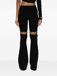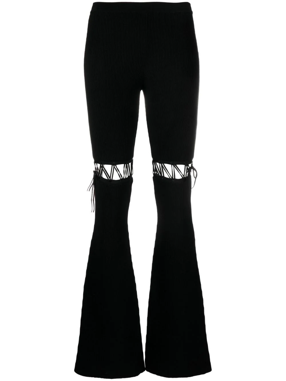 lace-up ribbed trousers These black Nensi Dojaka trousers blend the label's striking aesthetic with knitwear influences. Their ribbed, flared design is interrupted by lace-up details that create geometric cut-outs above the knees. Highlights - Black - Ribbed knit - Mid-rise - Lace-up detailing - Flared design Made in Italy Composition Viscose 82%, Polyester 17%, Polyamide 1% SIZE & FIT Model measurements Height 5 ft 11 in(1.8 m) Bust/Chest 33.07 in(84 cm) Hips 37.4 in(95 cm) Waist 25.19 in(64 cm) Measurement FRONT RISE 9.84 in(25 cm) HIPS 26.77 in(68 cm) WAIST 19.68 in(50 cm) FittingInformation Designed with a flared hem, these trousers allow for a close fit at the waist with a slim fit over the leg and widening towards the hem The elasticated waist allows for a comfortable fit Made from a midweight fabric This piece fits true to size – take your usual size Washing instructions Dry Clean Only