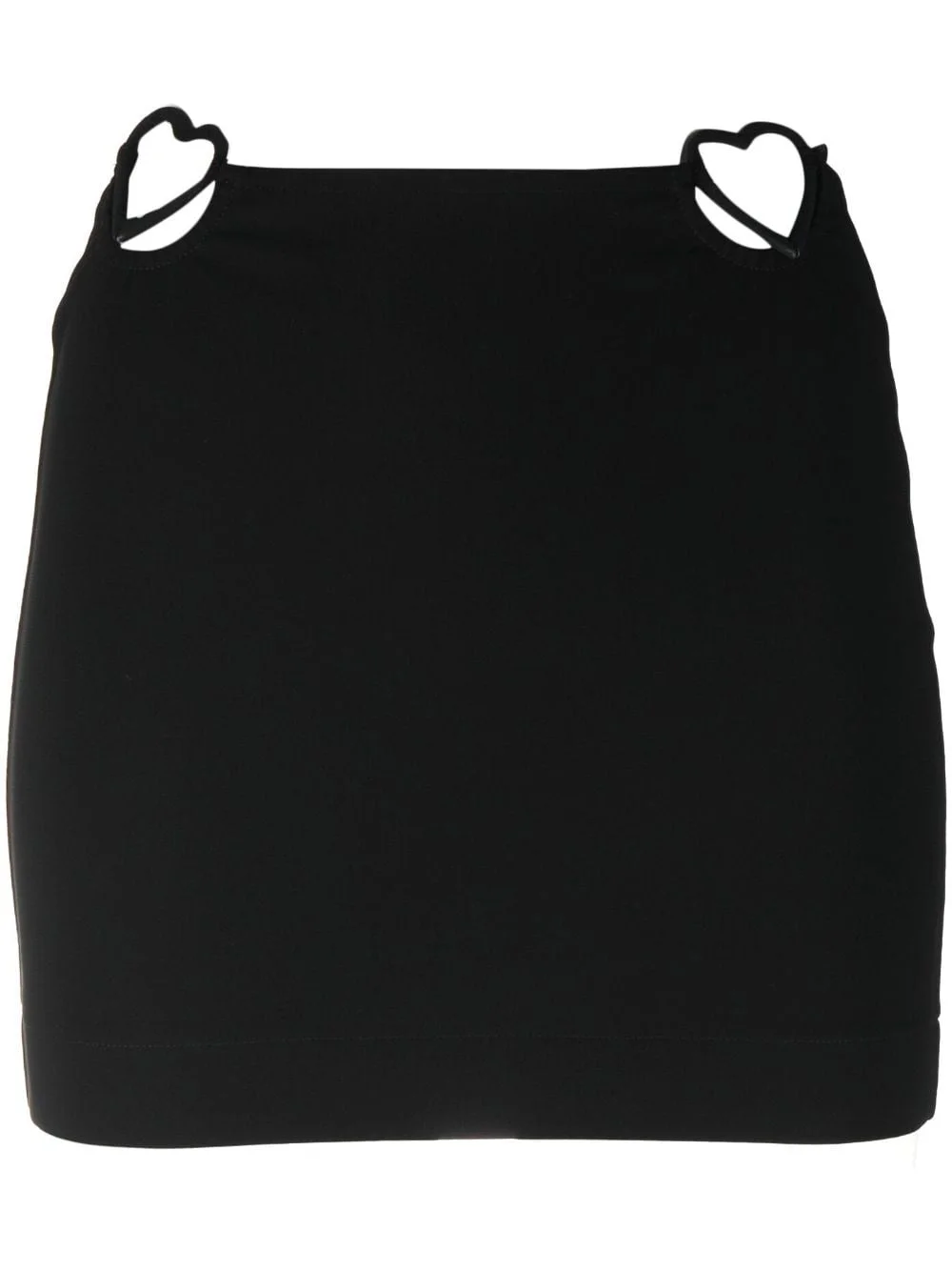 heart cut-out detail miniskirt Nensi Dojaka elevates the classic miniskirt with a romantic flair. Appearing in all-black, this mini silhouette features signature heart-shaped cut-outs to the sides. Highlights - Black - Heart cut - Cut-out detailing - Rear zip fastening - Thigh-length Made in Italy Composition Viscose 83%, Polyamide 12%, Spandex/Elastane 5% SIZE & FIT Model measurements Height 5 ft 11 in(1.8 m) Bust/Chest 33.07 in(84 cm) Hips 37.4 in(95 cm) Waist 25.19 in(64 cm) FittingInformation This mini-length skirt is intended to be worn just below the waist Made from a midweight stretch fabric, this piece offers elasticity and flexibility when worn This piece fits true to size – those with curvy hips may wish to take one size up Washing instructions Dry Clean Only