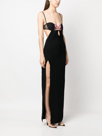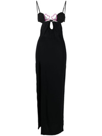 bustier-neck sleeveless gown Albanian-born designer Nensi Dojaka seeks inspiration from lingerie styles to create this SS23 maxi dress. Signature cut-outs and a thigh-high slit reveal flashes of skin, while two pink hearts connect the underwired bra neckline for a romantic finishing touch. Highlights - Black - Stretch-design - Bustier-style neckline - Heart motif - Cut-out detailing - Adjustable spaghetti straps - Rear hook and eye fastening - Side slit - Straight hem - Calf-length Made in Italy Composition Viscose 95%, Elastane 5% SIZE & FIT Model measurements Height 5 ft 11 in(1.8 m) Bust/Chest 31.49 in(80 cm) Hips 36.22 in(92 cm) Waist 25.59 in(65 cm) FittingInformation Designed for a close fit throughout Made from a lightweight stretch fabric, this piece offers elasticity and flexibility when worn This piece fits true to size – take your usual size Washing instructions Dry Clean Only