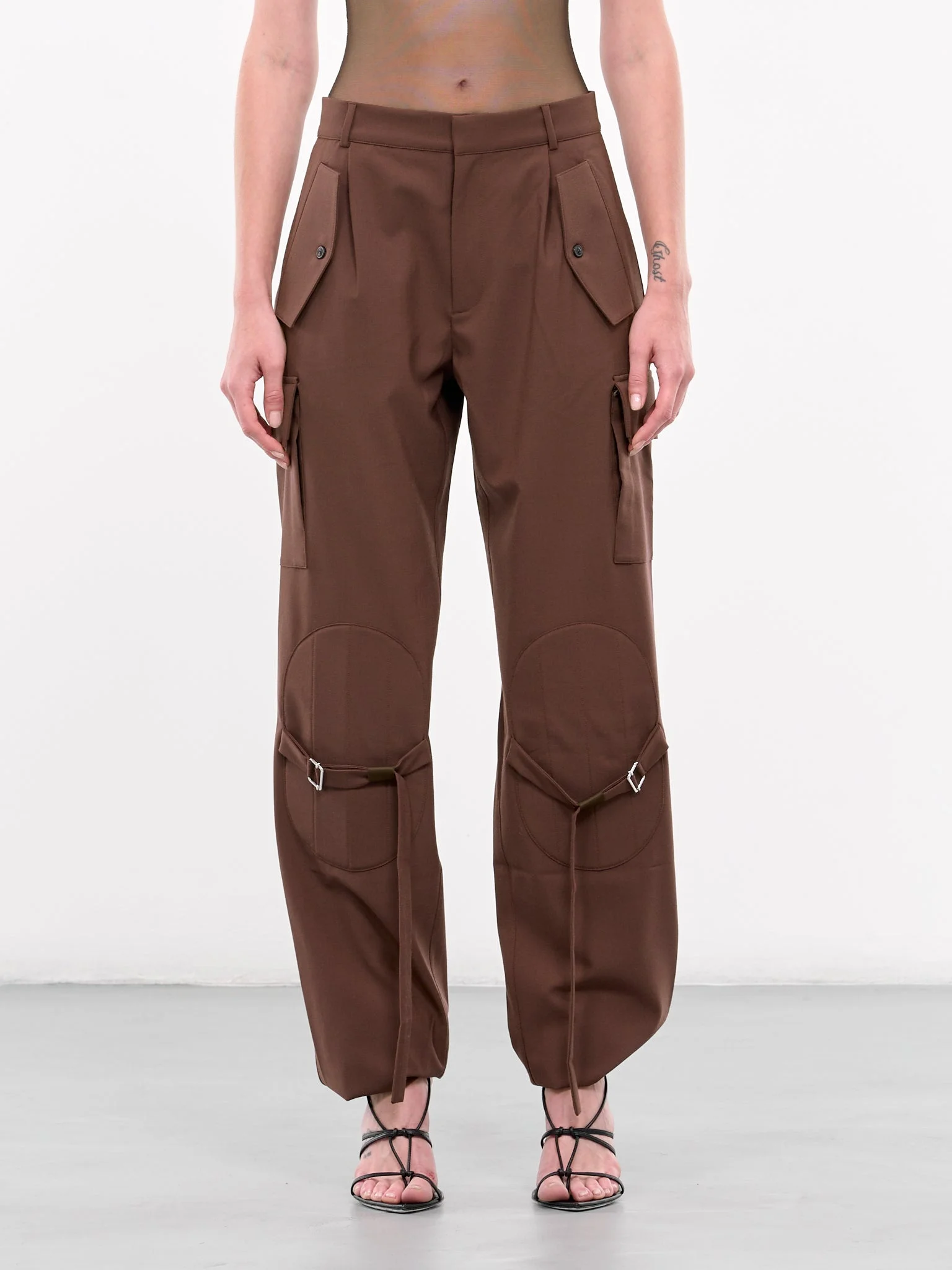 NENSI DOJAKA pants in brown, wool-poly blend, paneled construction, mid waist, belt loops, pleated, side buttoned flap pockets, side cargo pockets, knee pads, knee adjustable buckled strap, cinched cuffs, straight leg, relaxed fit. Made in Italy 53% Polyester 43% Virgin Wool 4% Elastane Standard Sizing Model is 5'8" wearing size S. Bust: 31" Waist: 23.5" Hips: 34"